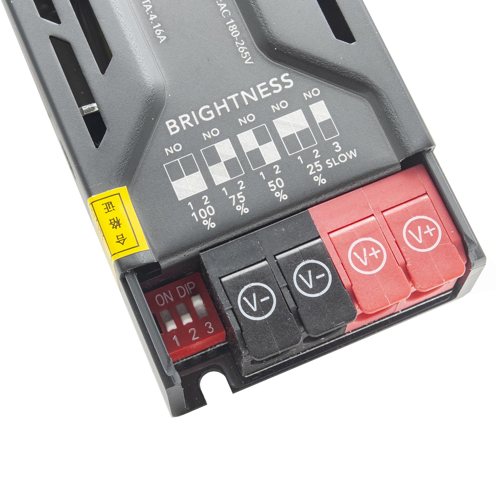 Innovativo alimentatore stabilizzato con design slim ideale per alimentare tutti i dispositivi che necessitano di alimentazione a 24V. Adatto per alimentare corpi illuminanti come strisce LED, faretti, impianti luminosi con tecnologia a LED. Ha una potenza di 100W con la possibilità di dimmerare la potenza dell luce abbassandone la luminosità fino al 25%, oppure impostando la massima potenza (100%). Questo consente di ottimizzare i consumi e creare l'atmosfera giusta negli ambienti. (NB. Per la dimmerazione seguire lo schema presente sull'alimentatore), in base al quale è possibile ipostare una potenza del 100%, 75%, 50%, ed il 25%.