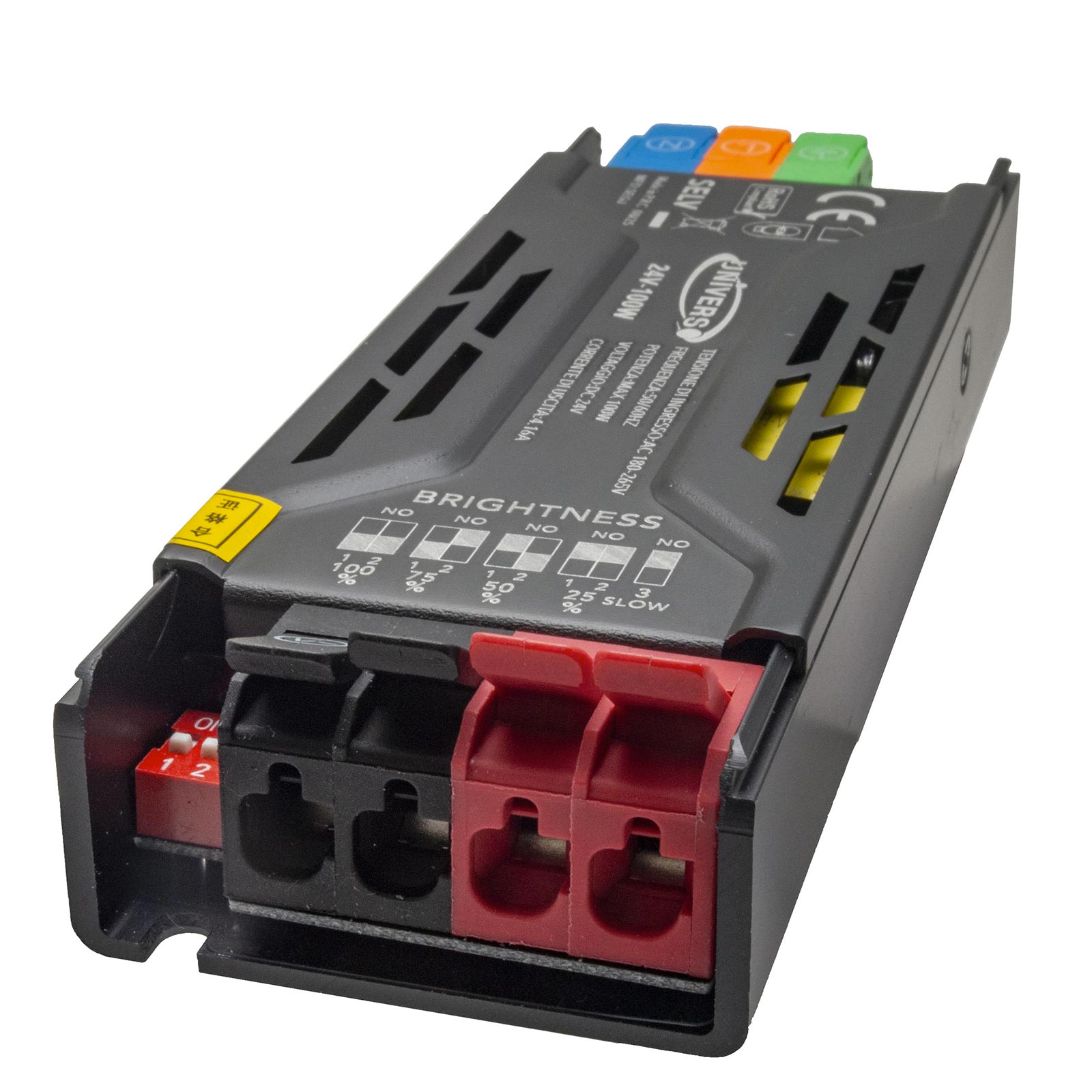 Innovativo alimentatore stabilizzato con design slim ideale per alimentare tutti i dispositivi che necessitano di alimentazione a 24V. Adatto per alimentare corpi illuminanti come strisce LED, faretti, impianti luminosi con tecnologia a LED. Ha una potenza di 100W con la possibilità di dimmerare la potenza dell luce abbassandone la luminosità fino al 25%, oppure impostando la massima potenza (100%). Questo consente di ottimizzare i consumi e creare l'atmosfera giusta negli ambienti. (NB. Per la dimmerazione seguire lo schema presente sull'alimentatore), in base al quale è possibile ipostare una potenza del 100%, 75%, 50%, ed il 25%.