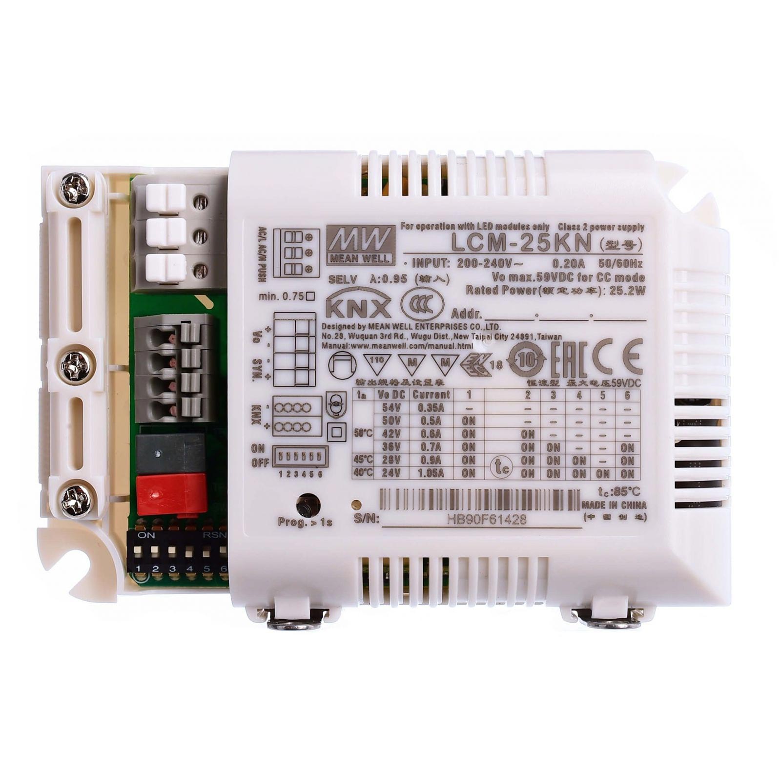 Alimentatore LED driver multi corrente a tensione constante dimmerabile via KNX dal design compatto di colore bianco ideale per l'alimentazione di corpi illuminanti a LED con potenza massima di 25W con diversi range di voltaggi, (VEDI TABELLA IN BASSO). Utile per alimentare gran parte di lampadine LED, faretti LED, strisce di LED, fari LED o le tue creazioni con componenti LED.
