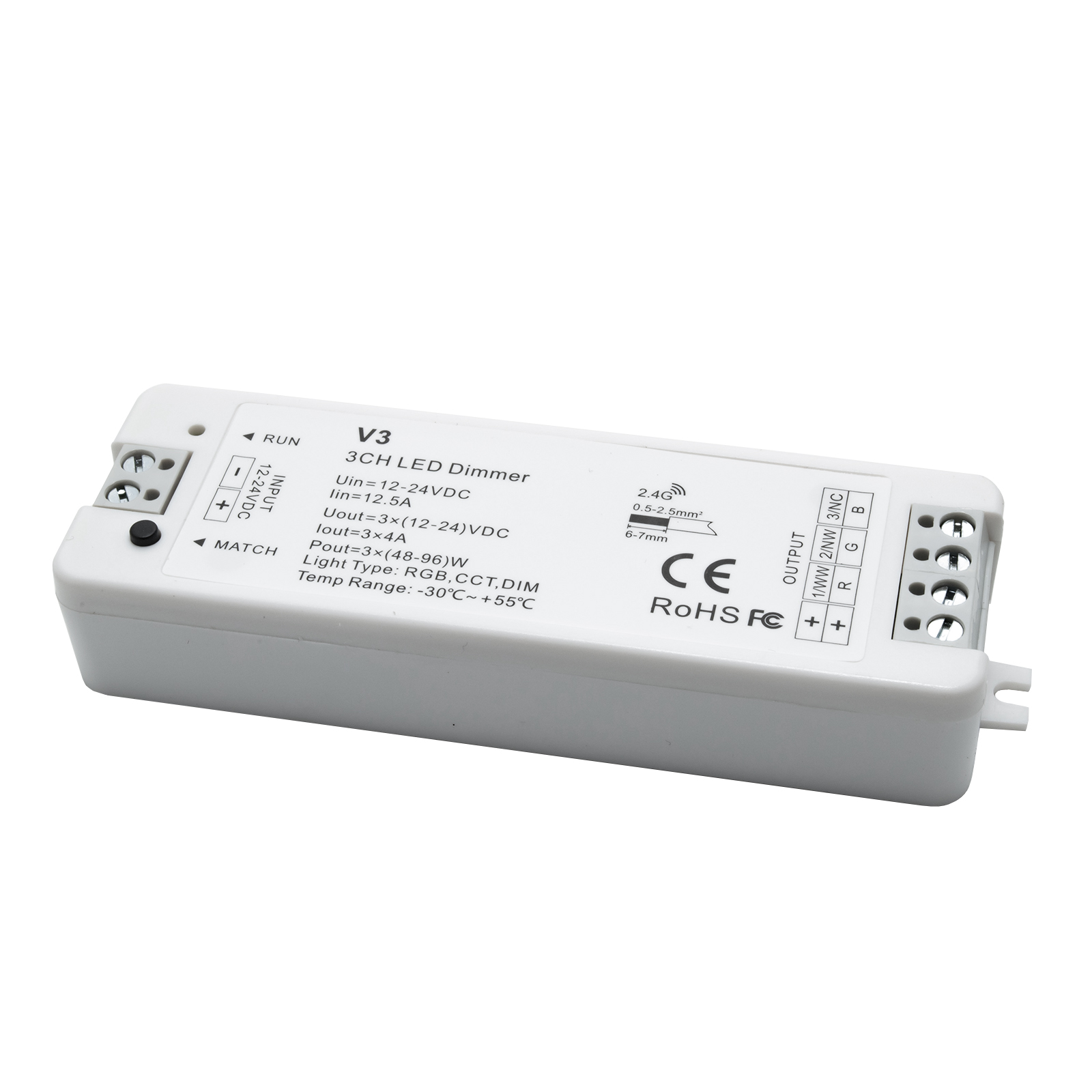 Centralina RF adatta per gesitire strisce, faretti e lampade LED RGB multicolore che si alimentano a 12V / 24V dotata di 3 canali 12.5A viene fornita completa di telecomando RF 2.4Ghz per gestire tutte le funzioni. Grazie a questa centralina è possibile cambiare colore di luce oppure abbassare o aumentare l'intensità luminosa.