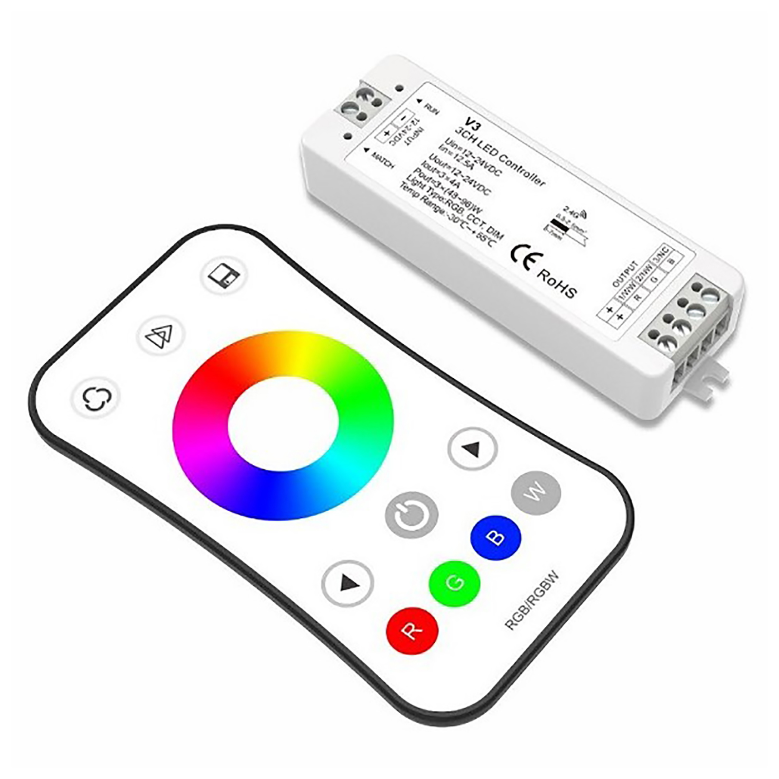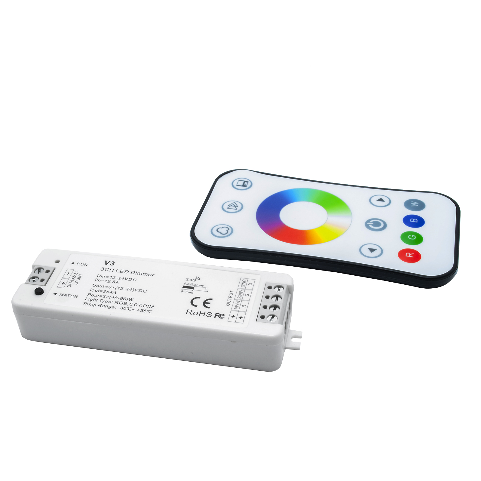 Centralina RF adatta per gesitire strisce, faretti e lampade LED RGB multicolore che si alimentano a 12V / 24V dotata di 3 canali 12.5A viene fornita completa di telecomando RF 2.4Ghz per gestire tutte le funzioni. Grazie a questa centralina è possibile cambiare colore di luce oppure abbassare o aumentare l'intensità luminosa.