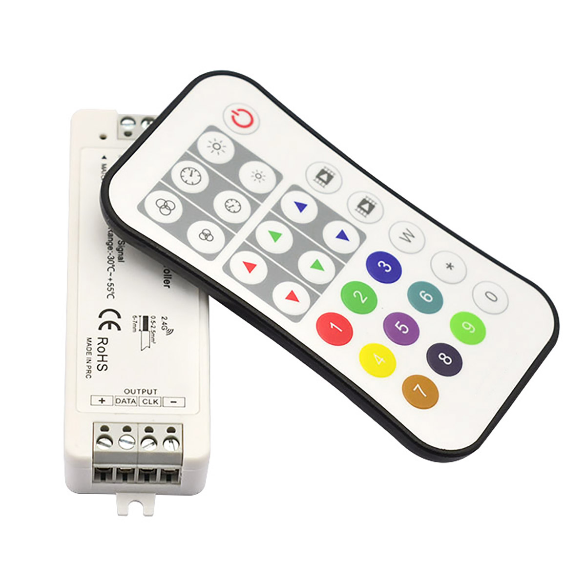 Controller R G B multi-pixel RF 2.4G design compatto con uscita del segnale SPI. Segnale SPI in uscita per controllare una varietà di luci LED digitali con i circuiti integrati compatibili sopra elencati. Tipo IC e R / G / B. La centralina si alimenta a 5-24V dc con amperaggio MAX 8A. Viene fornita completa di telecomando RF per gestire tutte le funzioni della striscia