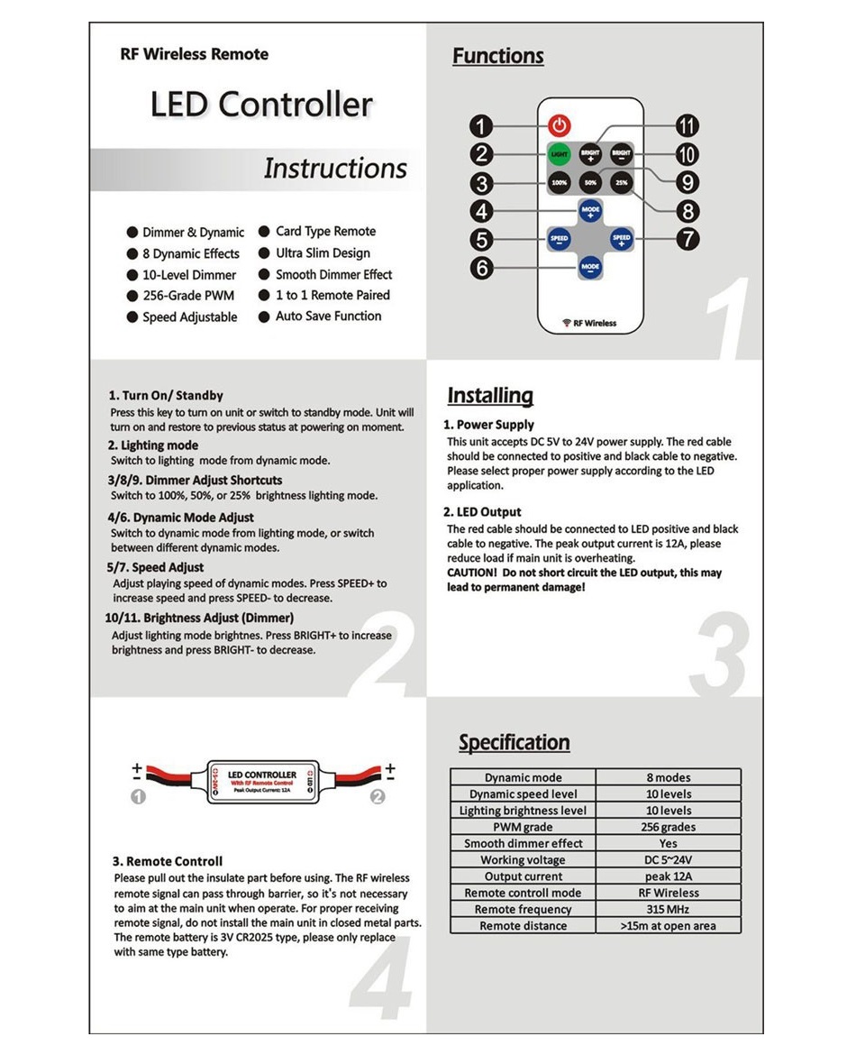 Telecomando RF completo di centralina dimmer per luci LED che consente di dimmerare una striscia LED o altra sorgente luminosa a LED con alimentazione 12V / 24V. Il telecomando RF è incluso con capacità di controllo distanza max 30 metri, È possibile creare 8 modalità di luce differenti con il tasto e regolarne la velocità con il tasto speed,