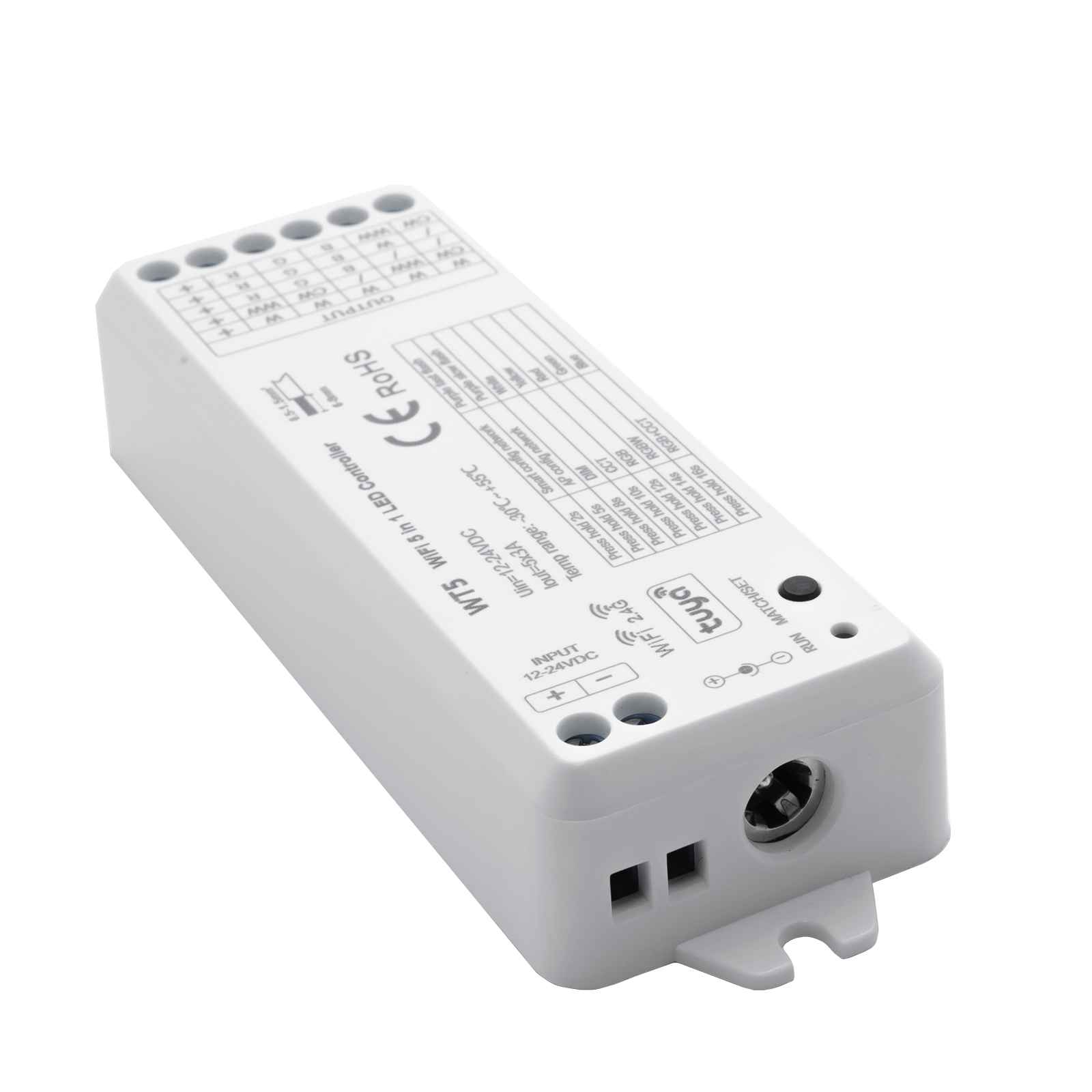 Ricevitore controller 5 in 1 per strip RGB+CCT, RGBW, RGB, CCT e monocromatiche 12V/24V. È possibile comandarlo in Wi-Fi tramite Tuya app o assistenti vocali Amazon Alexa e Google Home, oppure associarlo a tutti i telecomadi RF 2.4G. Ogni controller WT5 può funzionare anche come convertitore WiFi-RF, quindi è possibile utilizzare l'APP Tuya per controllare uno o più controller LED RF o driver led dimmerabili RF.