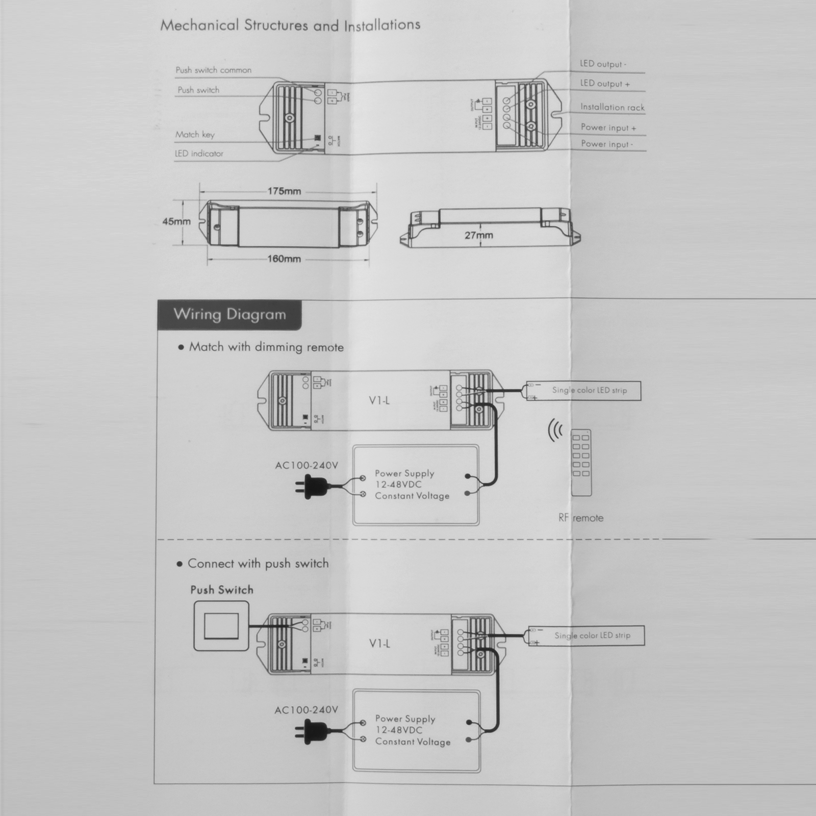 Inoltre è possibile collegare un interruttore esterno pusch che consente di dimmeare la luce. Questa centralina lavora in radio frequenza a 2.4 GHz. e ha una potenza massima di 480W con un amperaggio massimo di 15A. E' possibile gestire questa centralina tramite telecomando RF o pannelli da parete.