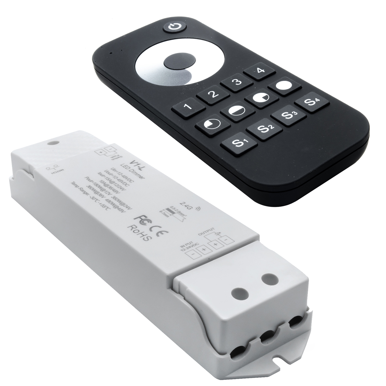 Centralina dimmer che utilizza la tecnologia wireless a 2.4GHz per controllare e gestire strisce monocolore o singol color. Grazie a questo regolatore, si può gestire la luminosità della striscia per creare un ambiente adatto per ogni occasione e necessità. Adatto per strisce LED con alimentazione da 12V a 48Vdc. Alimentazione da 12V a 48V.