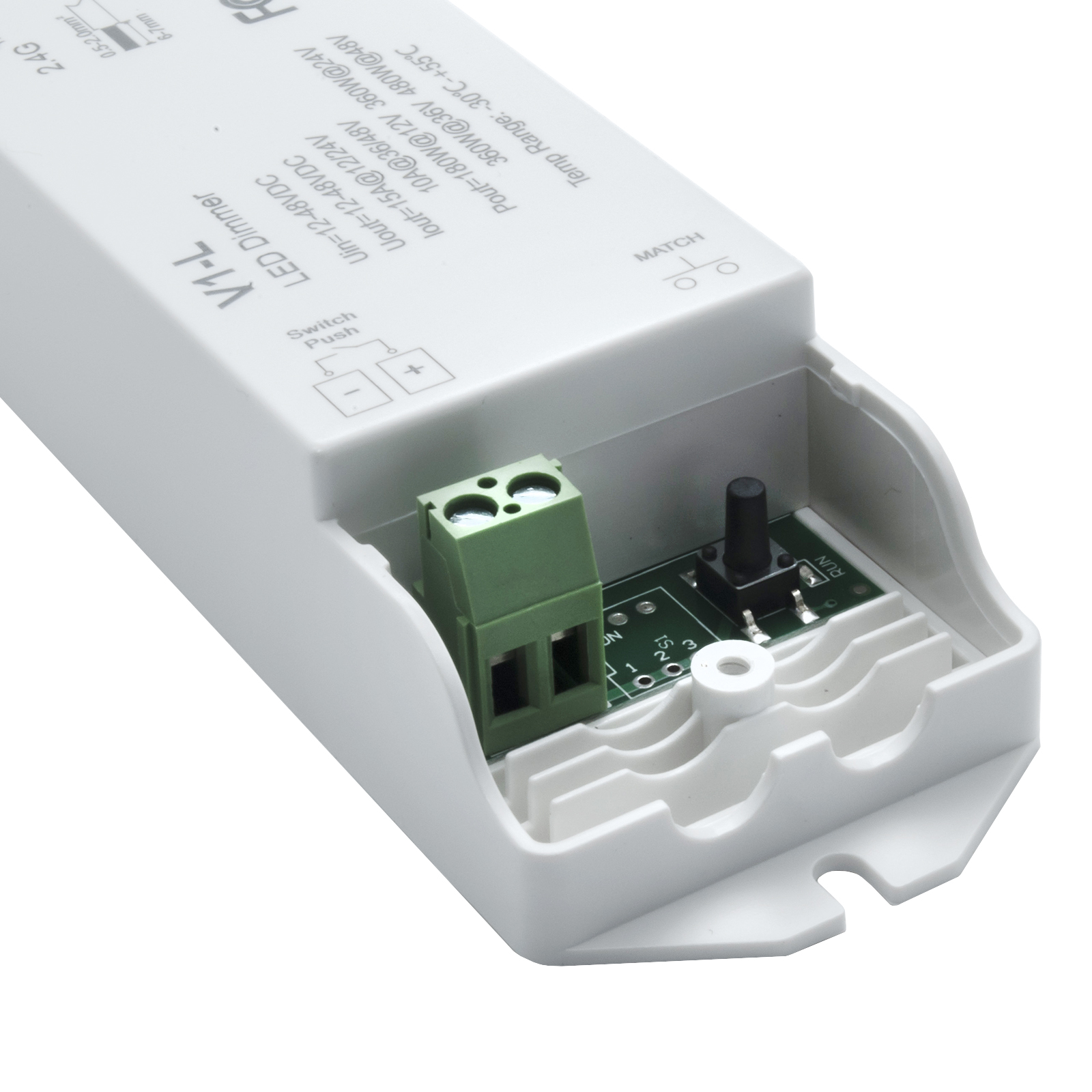 Questo dimmer è realizzato in plastica di colore bianco dalla forma compatta e grazie alla tecnologia RF a 2.4 Ghz possiamo nasconderlo facilmente. Semplice da installare e da configurare, dotato di pulsante per la sincronizzazione con il telecomando per gestire la luminosità della striscia a distanza.