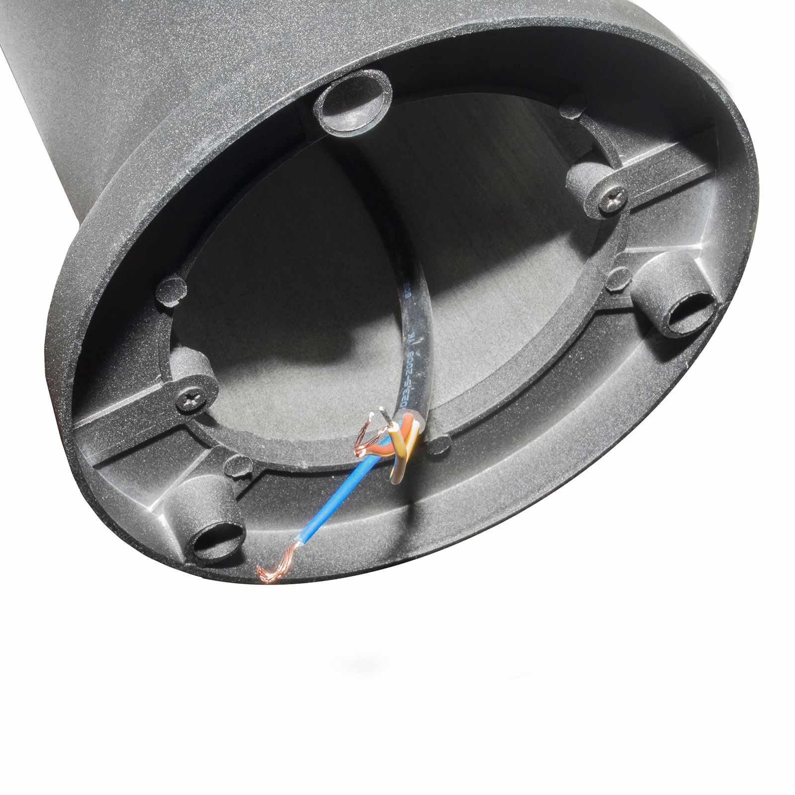 Se alimenta a 100-240 V conectando los cables directamente a la red eléctrica (no incluye toma de corriente). Cuenta con 4 orificios de fijación y se suministra con tornillos para una correcta instalación.