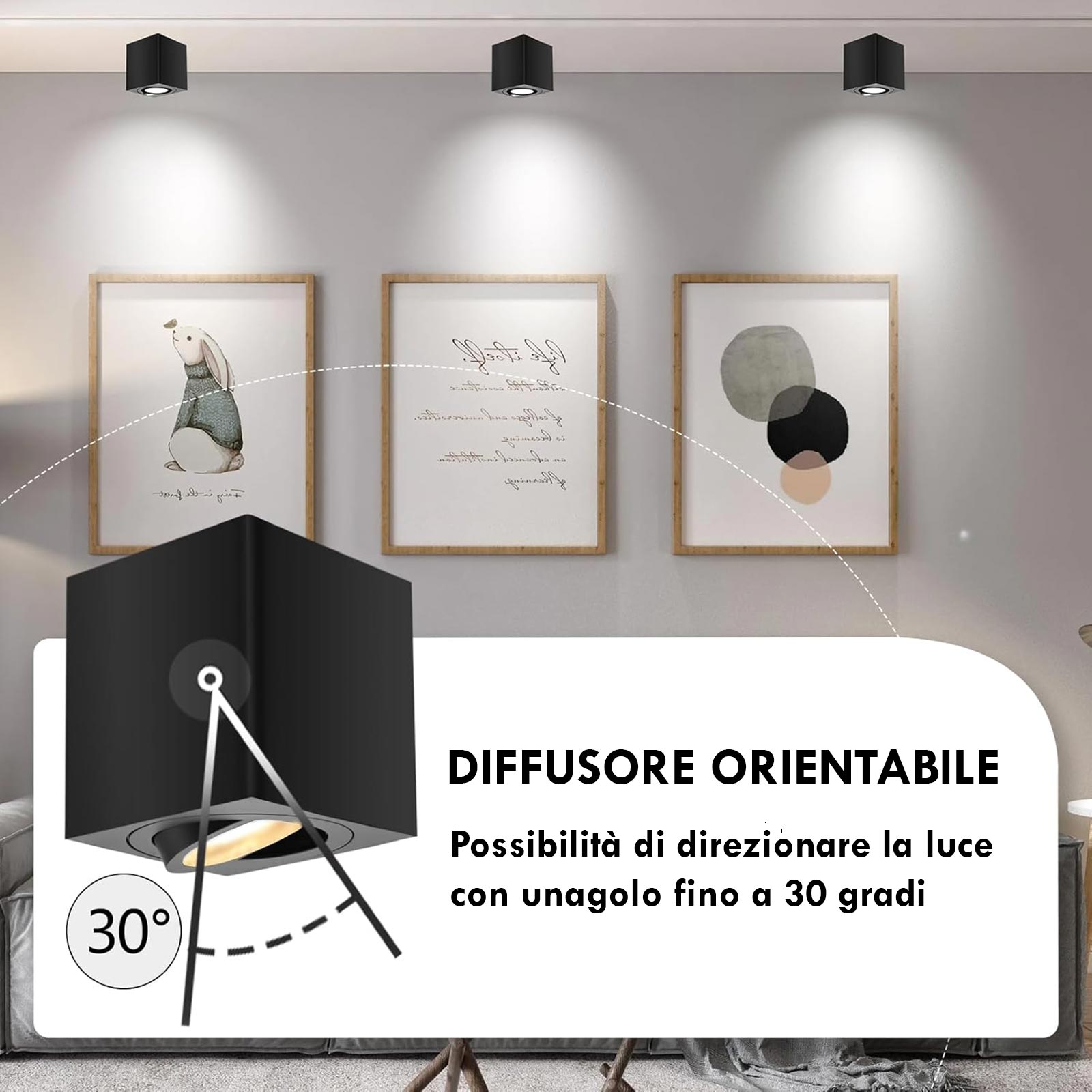 Faretto moderno da soffitto ideale per ambienti privi di controsoffitto dotato di attacco GU10 realizzato in alluminio di forma quadrata compatibile con lampade e faretti con attacco GU10, ideale per l'illuminazione interna a soffitto utile per dare luce a cucine, uffici, soggiorni, bagni, negozi, attività commerciali, locali commerciali, pizzerie, bar, pub.