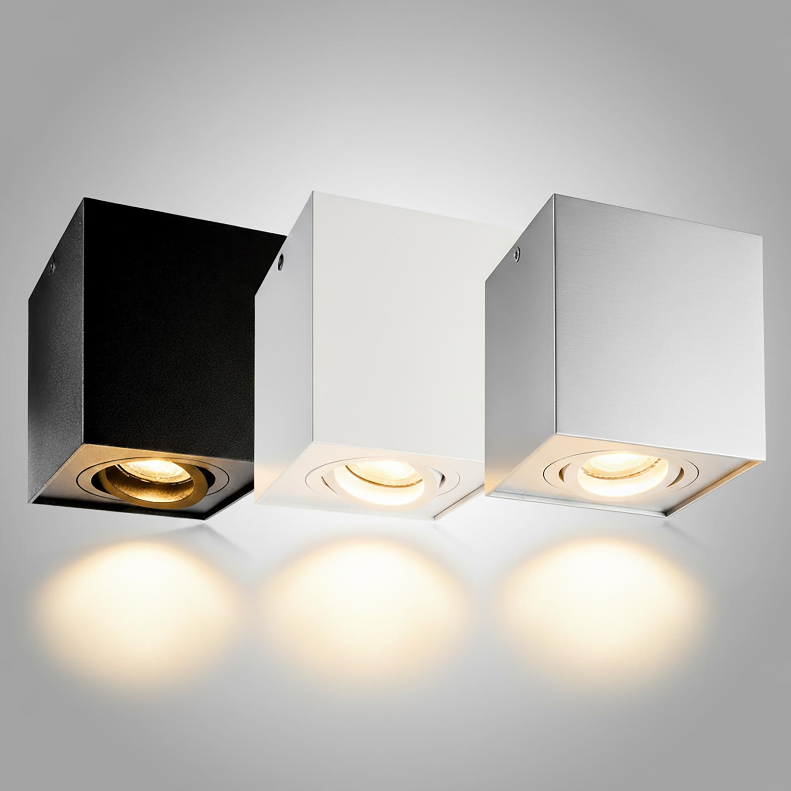 Faretto moderno da soffitto ideale per ambienti privi di controsoffitto dotato di attacco GU10 realizzato in alluminio di forma quadrata compatibile con lampade e faretti con attacco GU10, ideale per l'illuminazione interna a soffitto utile per dare luce a cucine, uffici, soggiorni, bagni, negozi, attività commerciali, locali commerciali, pizzerie, bar, pub.