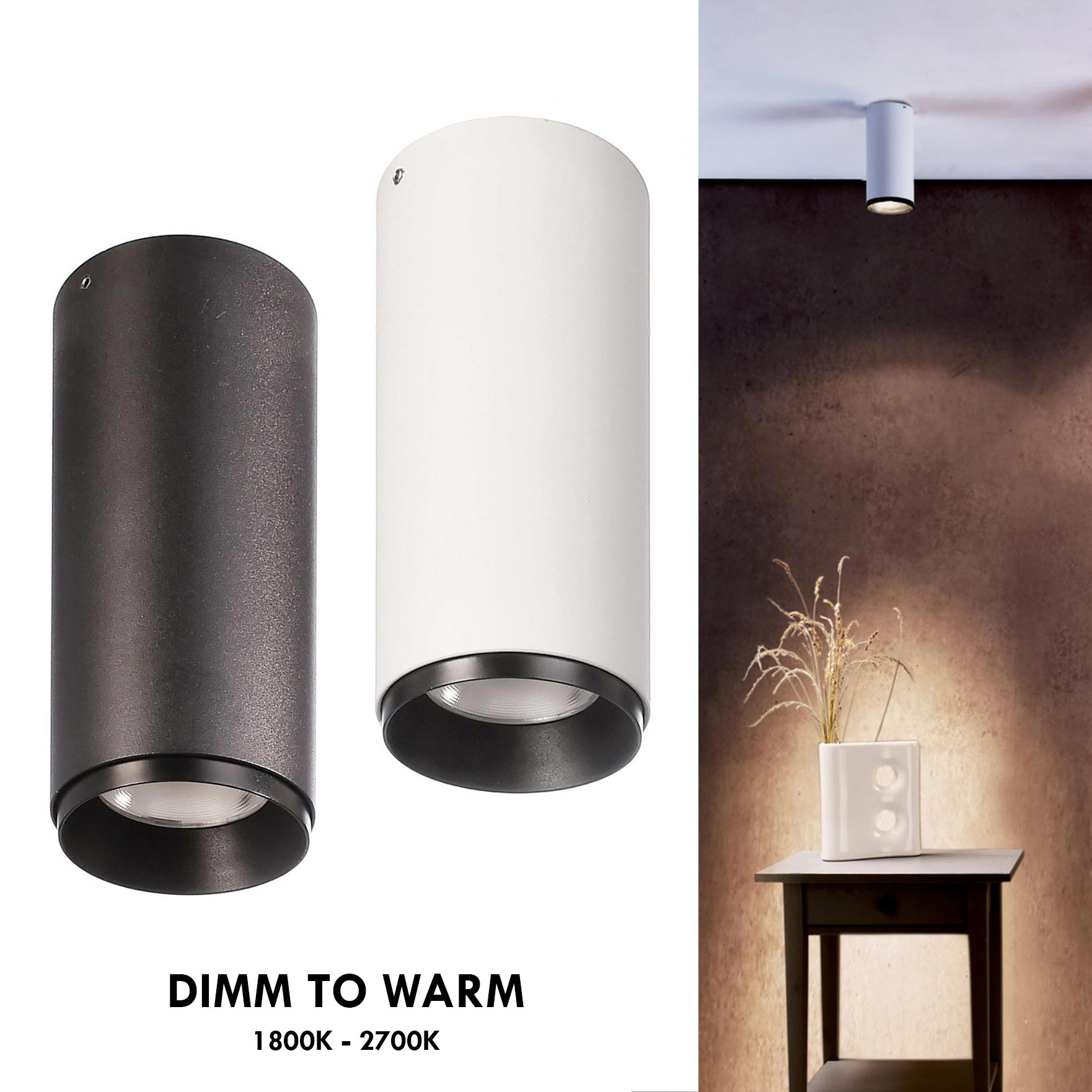 Realizzato in alluminio di forma cilindrica è disponibil in 2 colori: Biano e Nero, monta un LED COB di ultima generazione da 10W dimmerabile che varia la temperatura di luce da 1800K (minima potenza) a 2700K (massima potenza)Ideale per adattarsi a tutti gli ambienti per ogni situazioni. Facile da installare va fissato a soffitto e si alimenta direttamente alla rete elettrica a 230V. Il LED integrato emette un'intensità luminosa di 750 lumen.