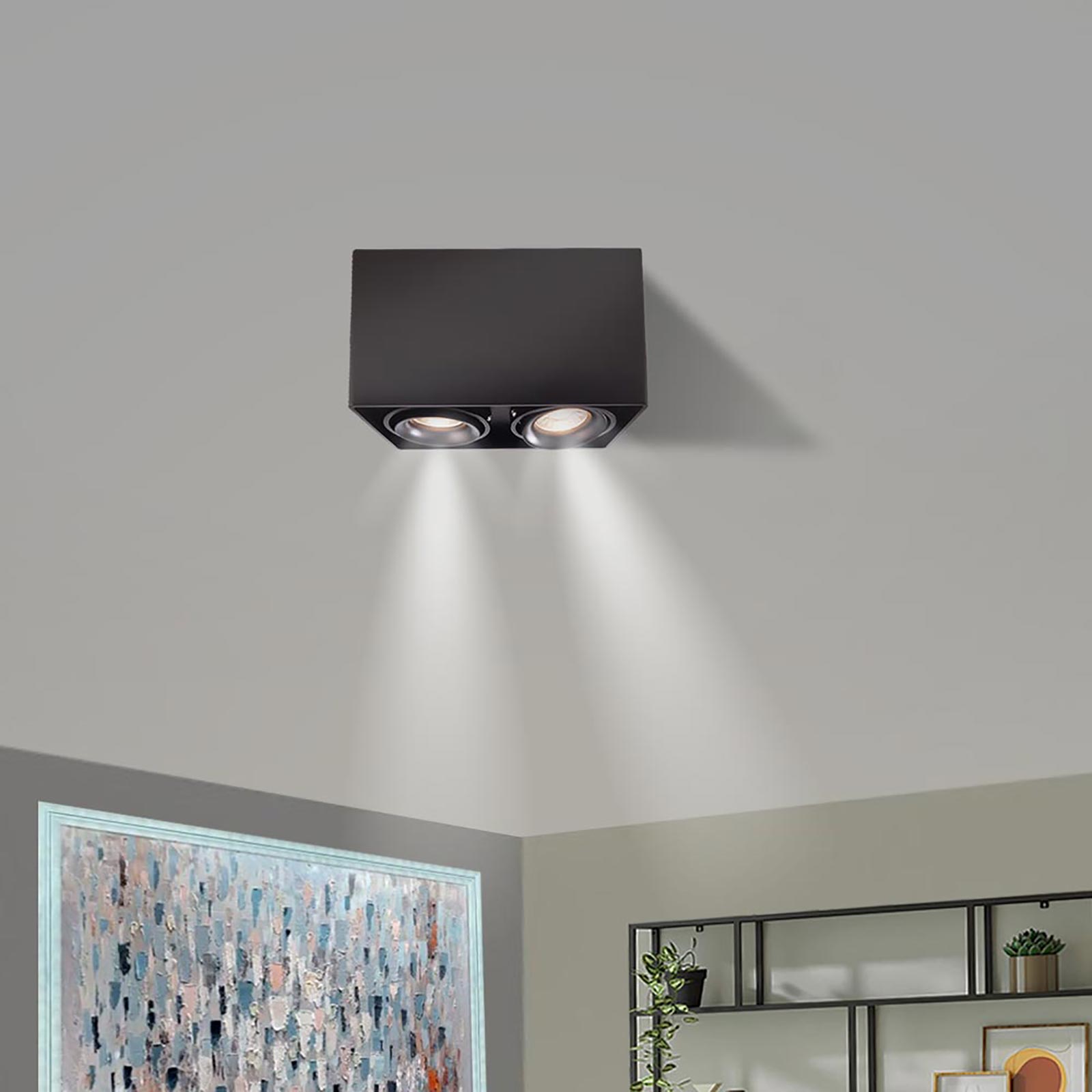 Faretto moderno da soffitto con doppio diffusore orientabile con attacco GU10 realizzato in alluminio pressofuso ideale per l'illuminazione interna di uffici, negozi, all'interno di abitazioni per illuminare cucine moderne, soggiorni, camere da letto. Supporta lampade e faretti con attacco GU10. Dotato di base di fissaggio alla quale si aggancia il corpo illuminante ideale per ambienti privi di controsoffitto
