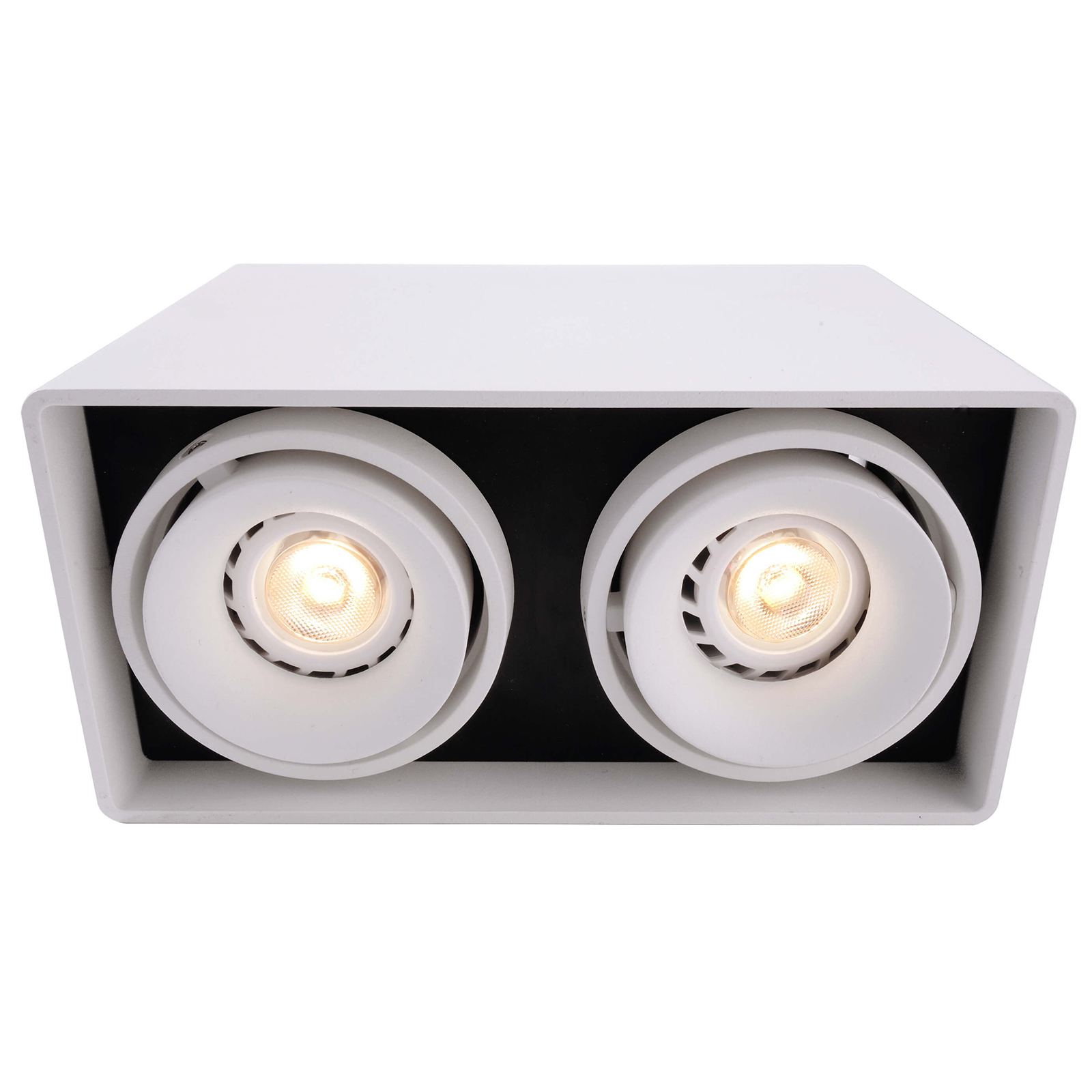 Faretto moderno da soffitto con doppio diffusore orientabile con attacco GU10 realizzato in alluminio pressofuso ideale per l'illuminazione interna di uffici, negozi, all'interno di abitazioni per illuminare cucine moderne, soggiorni, camere da letto. Supporta lampade e faretti con attacco GU10. Dotato di base di fissaggio alla quale si aggancia il corpo illuminante ideale per ambienti privi di controsoffitto