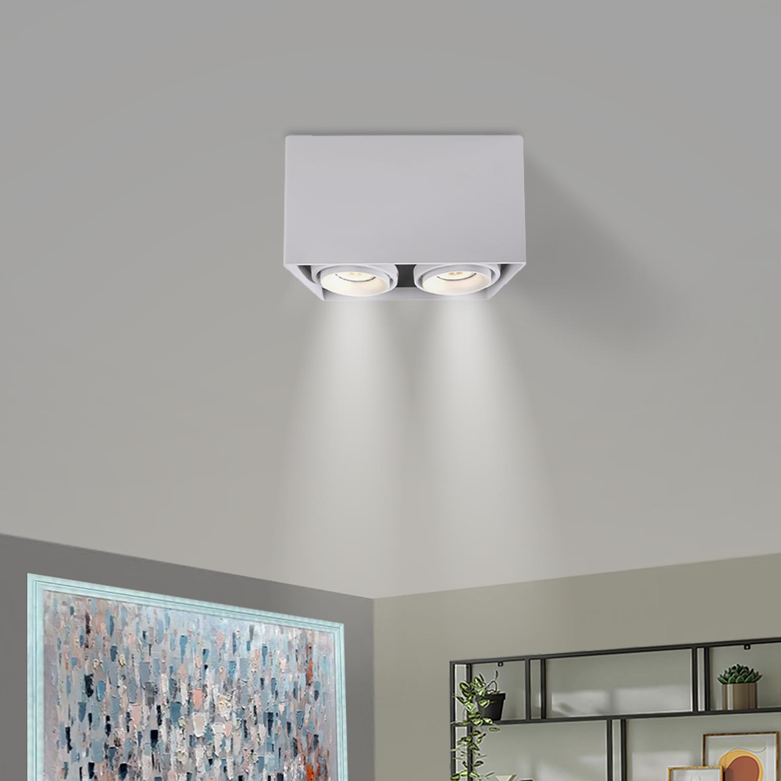 Faretto moderno da soffitto con doppio diffusore orientabile con attacco GU10 realizzato in alluminio pressofuso ideale per l'illuminazione interna di uffici, negozi, all'interno di abitazioni per illuminare cucine moderne, soggiorni, camere da letto. Supporta lampade e faretti con attacco GU10. Dotato di base di fissaggio alla quale si aggancia il corpo illuminante ideale per ambienti privi di controsoffitto