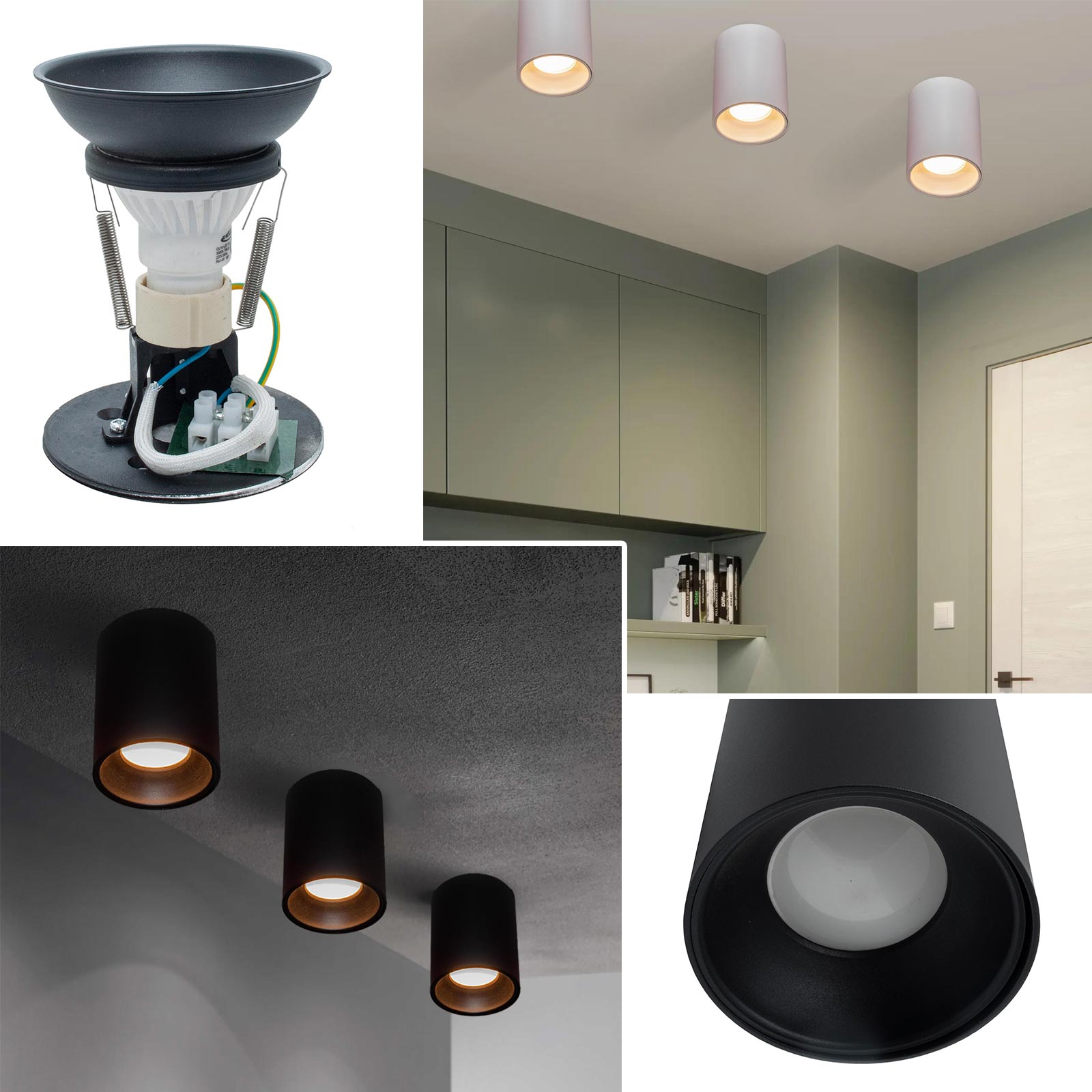 Design elegante e versatile: Disponibile nei colori bianco o nero, il suo design cilindrico si adatta perfettamente a tutti gli ambienti moderni, conferendo un tocco di originalità. Il pratico sistema a molle per il fissaggio garantisce maggiore stabilità senza l'uso di ferma faretti in metallo.