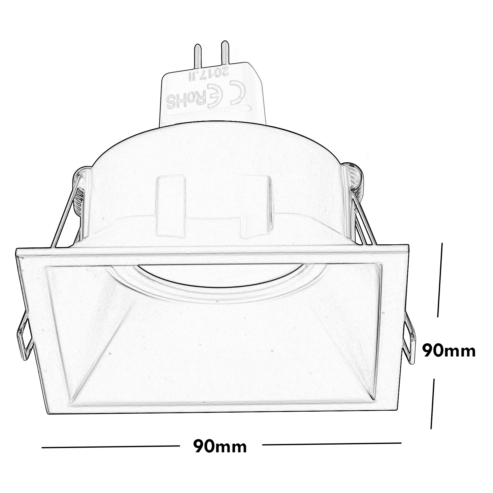 Dimensioni consigliate per il foro dell'incasso: 80mm - Dimensioni esterne: 90mm - Altezza della lampada 55mm. Nella confezione è incluso l'attacchino GU5.3.
