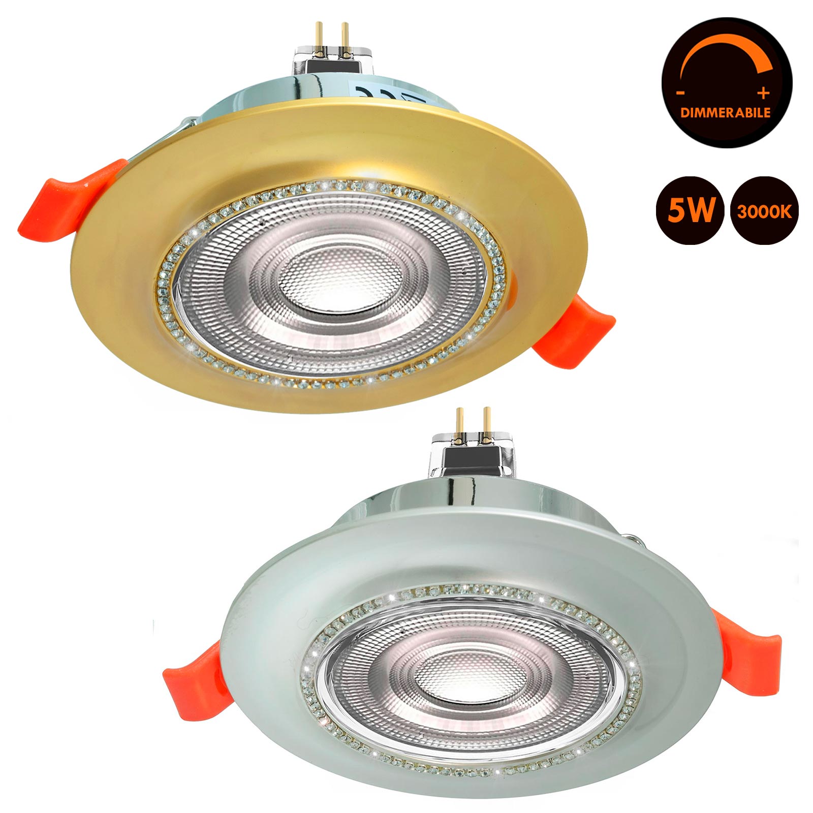 Elegante faretto da incasso con cornice brillantinata completo di lampada LED 5W MR16 dimmerabile a risparmio energetico, adatto per installazioni in ambienti interni per l'illuminazione di barche, camper, roulotte ed in tutti quei posti dove si vuole installare una fonte di luce versatile e funzionale. Il portafaretto è realizzato in metallo di forma tonda.