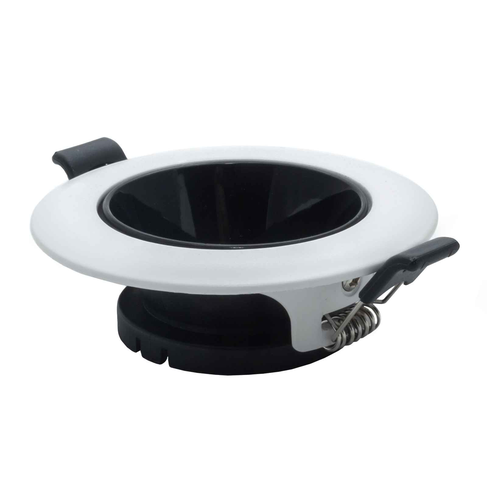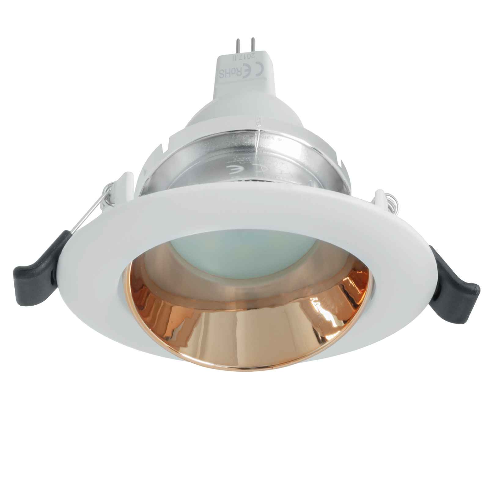 Faretto tondo orientabile ad incasso a molla con cornice in alluminio bianco disponibile con diffusore in 3 colori nero, silver ed oro rosa completo di alette per il fissaggio in soffitto di cartongesso. Dotato di lampada a bassa tensione ideale per dare un tocco di eleganza ai propri ambienti interni come cucine, soggiorni, uffici, negozi, adatto anche per barche, camper. Il diffusore consente di orientare la luce secondo le proprie esigenze.