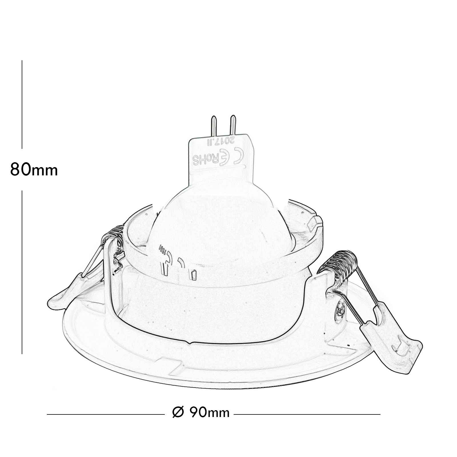 Il faretto si inserisce dal retro, questo evita di utilizzare ferma faretti in metallo che possono risultare antiestetici. Compatibile con tutti i fori da 75 mm. Diametro: 90mm - Spessore 30mm - Profondità con lampada: 80mm