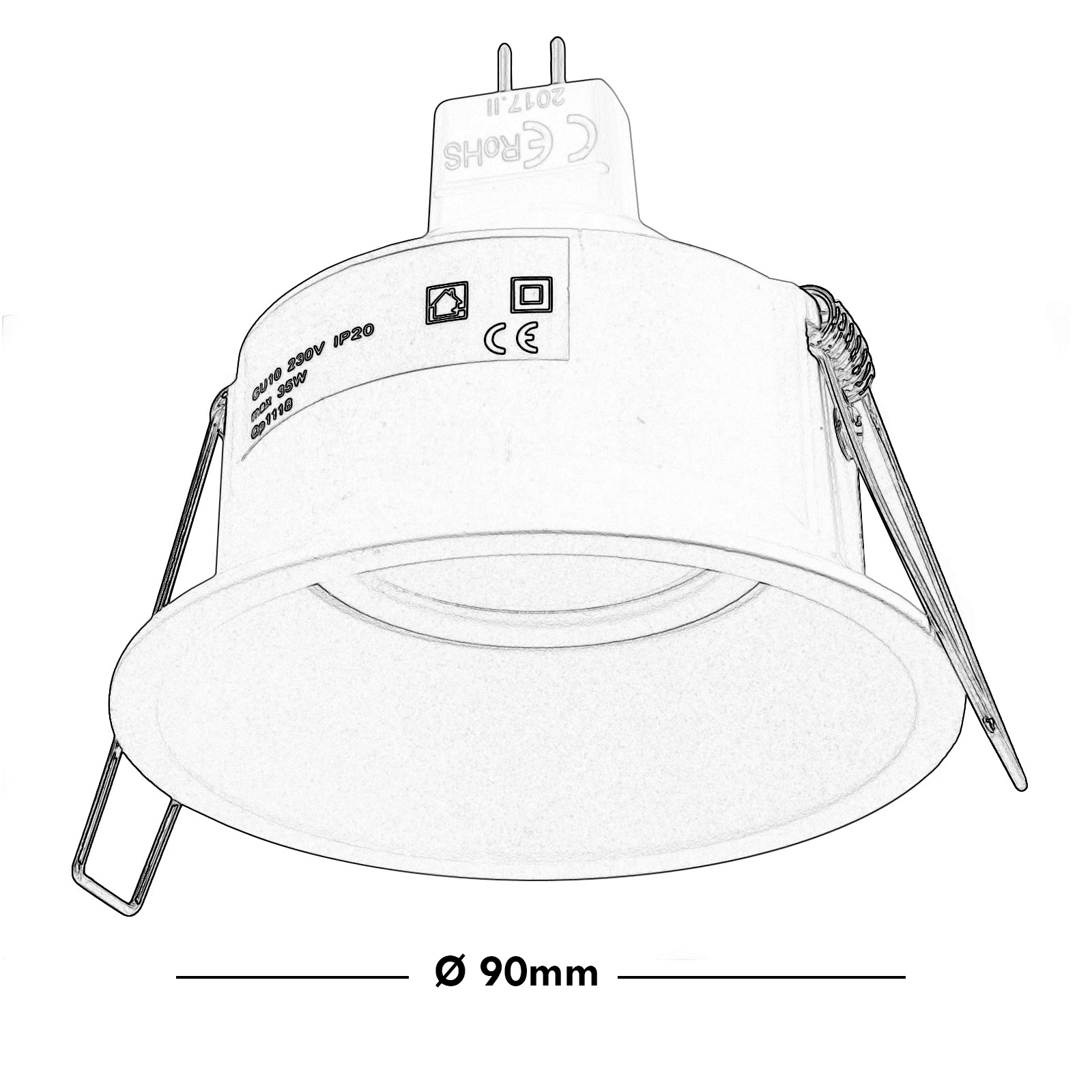 Dimensioni consigliate per il foro dell'incasso: 80mm - Dimensioni esterne: Ø 90mm - Altezza della lampada 55mm. Nella confezione è incluso l'attacchino GU5.3.