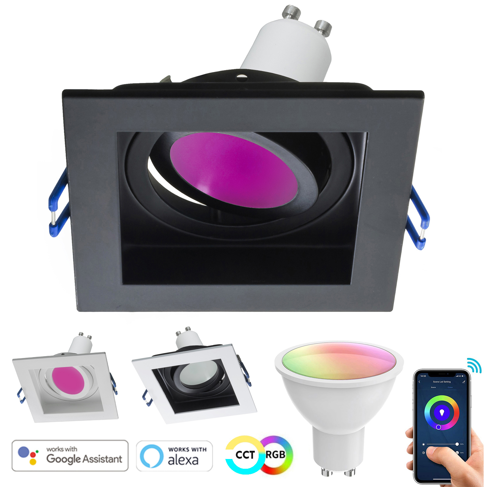 Faretto SMART dal design moderno con cornice quadrata dotato di diffusore orientabile con alette a molla per l'incasso in soffitti di cartongesso realizzato in alluminio vine fornito completo di lampada LED da 5W con tecnologia RGB+CCT attacco GU10 compatibile con Amazon Alexa e Google Home, ideale per l'illuminazione e la decorazione di ambienti interni, da incassare in controsoffitti di cartongesso. La lampada è intercambiabile in caso di rottura a differenza di prodotti con LED integrati.