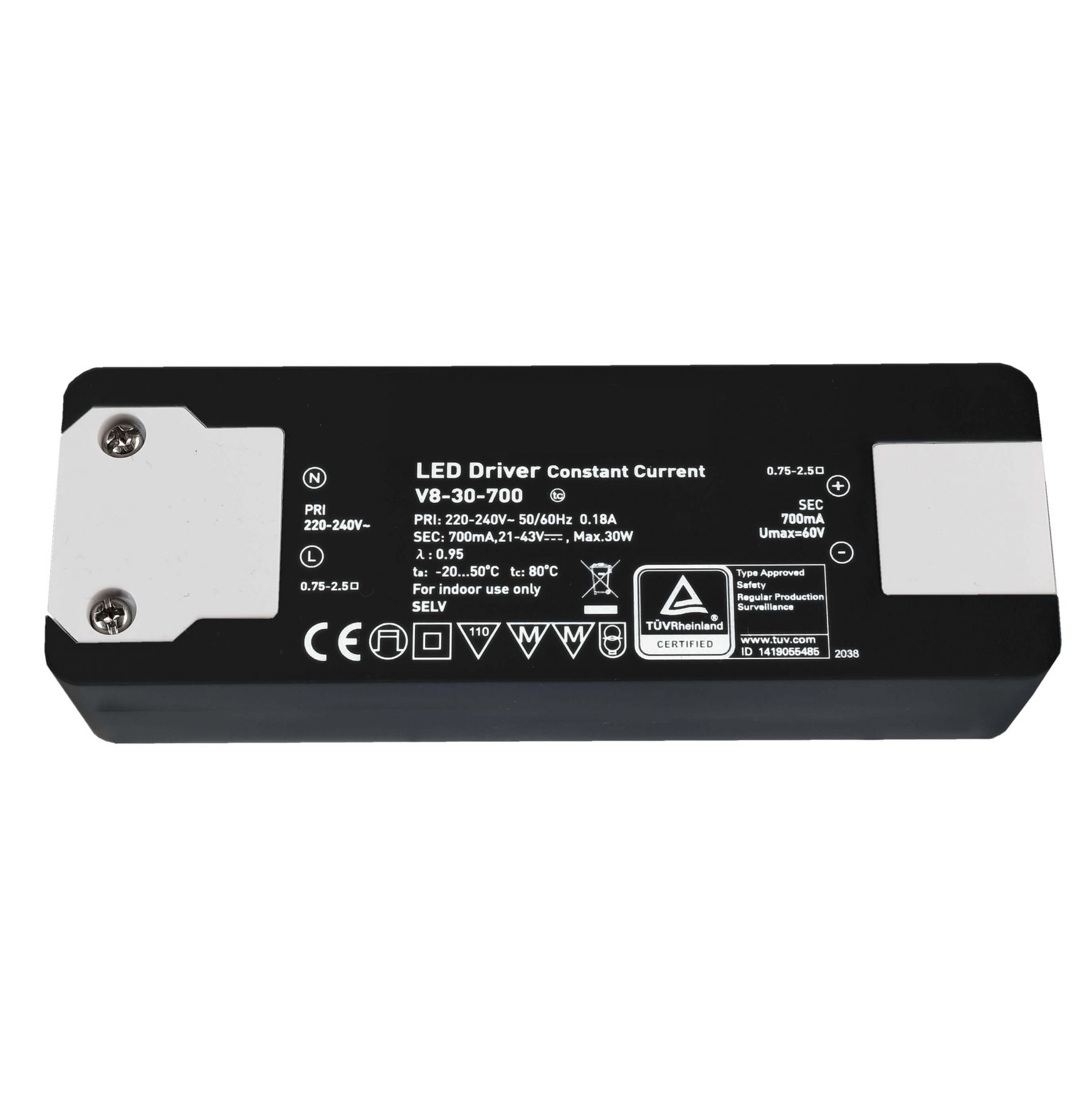 NB. è possibile acquistare il faretto anche completo di alimentatore con tensione di uscita: 13-43V dc 700 mA - Tensione di ingresso: 220-240 V CA/50-60 Hz - massima potenza: 14.7-30.00W - Dimensioni alimentatore: 127mm x 43mm x 28mm.