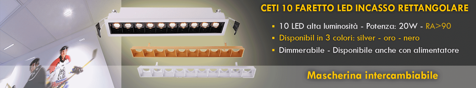 Questo faretto è dotato di macherina intercambiabile disponbile in 3 colori: con nera, silver, e dorata. Ha un angolo di luce di 45 gradi con un'intensità luminosa di 1600 lumen, adatto anche per bar, reception, reparti commerciali, reparti controllo qualità, sala conferenza, show room.