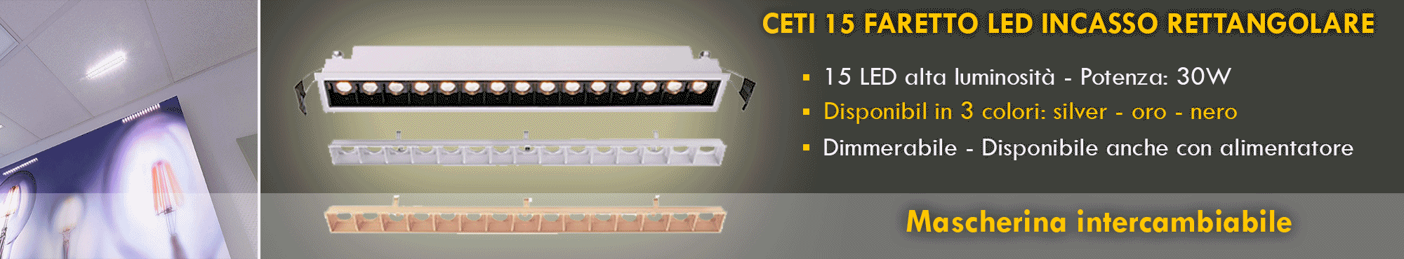 CETI 15 Elegante faretto LED spot da incasso di forma rettangolare realizzato in alluminio pressofuso adatto per l'illuminazione di negozi, vetrine, all'interno di abitazioni moderne per illuminare corridoi, ingressi, cucine, soggiorni ed in tutti quei posti dove si vuole installare un prodotto dal design moderno che oltre ad illuminare decora il soffitto. Dotato di alette a molla per l'incasso in soffitti di cartongesso.