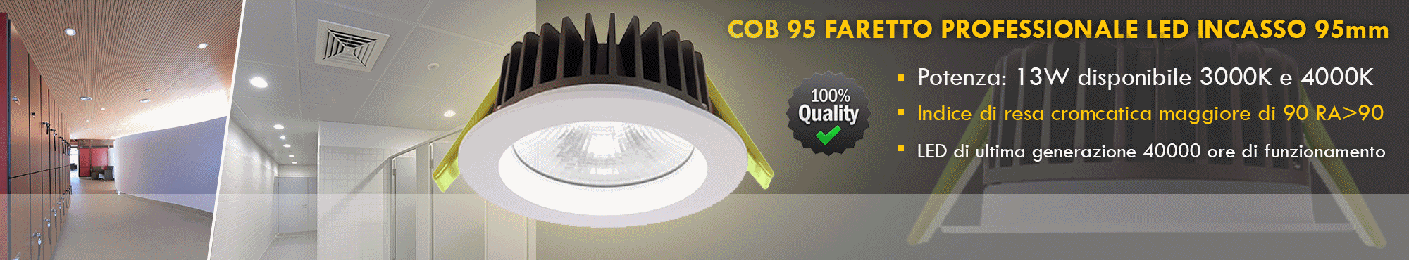 COB 95 elegante faretto professionale di forma tonda realizzato in alluminio di colore bianco con materiali di qualità superiore dotato di alette a molla per l'incasso in controsoffitti di cartongesso compatibile con tutti i fori da 95mm. Il faretto è dotato di un LED COB integrato di ultima generazione ad alta efficienza energetica con una potenza di 13W. Ideale per l'illuminazione commerciale e civile come bar, reception, uffici, reparti commerciali, reparti controllo qualità, sala conferenza, show room, negozi.