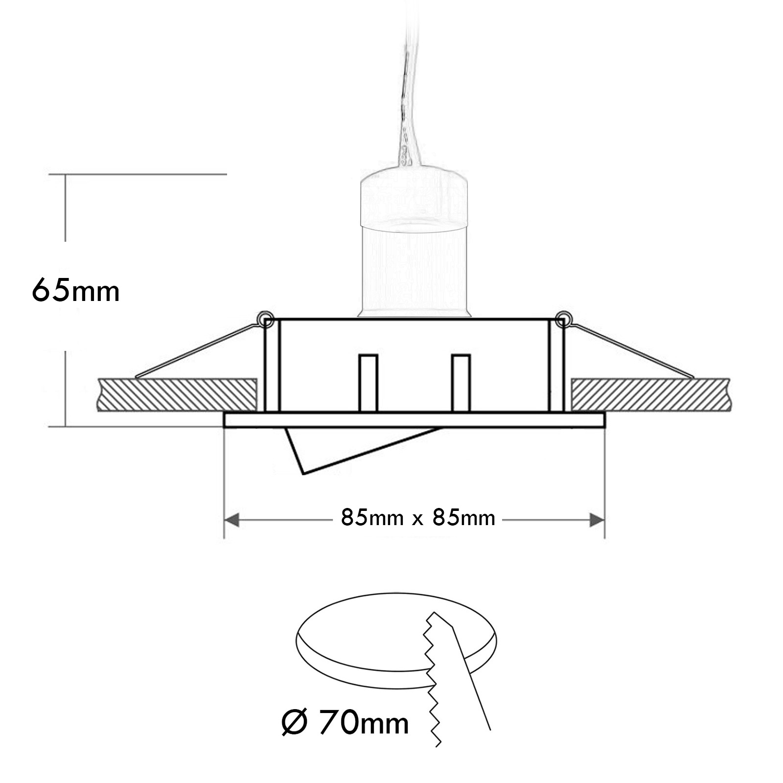 Adatto a fori di incasso da 70 mm, con dimensioni esterne di 85 mm x 85 mm ed un'altezza totale di 65 mm (comprensivo di lampada e attacchino GU10). Il faretto viene spedito completo di attacchino GU10 incluso.