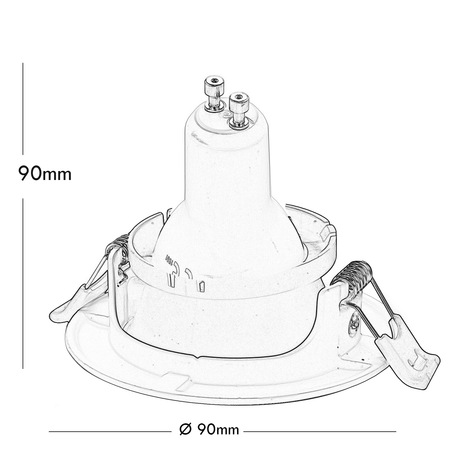 Il faretto è compatibile con fori da incasso da 75 mm e ha un diametro esterno di 90 mm per una profondità complessiva di 90 mm (con lampadina). Il sistema a molla permette un’installazione facile su controsoffitti in cartongesso, senza necessità di staffe o componenti visibili. L’alimentazione avviene direttamente a 230V, rendendolo adatto all’uso residenziale e commerciale.
