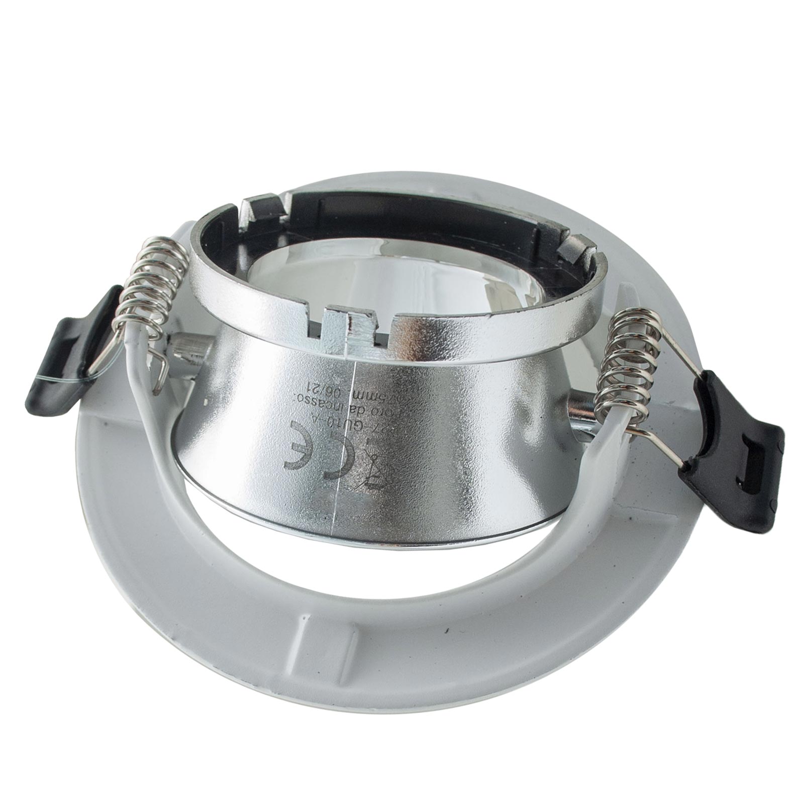 Il faretto è compatibile con fori da incasso da 75 mm e ha un diametro esterno di 90 mm per una profondità complessiva di 90 mm (con lampadina). Il sistema a molla permette un’installazione facile su controsoffitti in cartongesso, senza necessità di staffe o componenti visibili. L’alimentazione avviene direttamente a 230V, rendendolo adatto all’uso residenziale e commerciale.