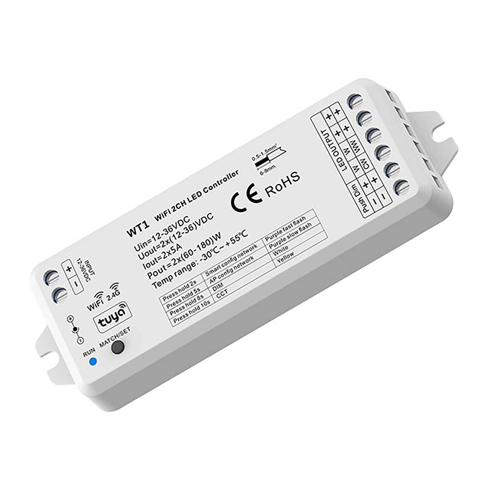 In tutti i Set è inclusa la centralina WiFi: La centralina si alimenta a 12V/24V ed è dotata di 2 canali supporta un carico massimo per canale di 5A (Totale corrente: 10A). Il controller ha una potenza di 60W / 180W (120-360W potenza totale). Dotato di interruttore che consente la sincronizzazione con centraline, telecomandi, router. Segnale d'ingresso: Tuya App+Amazon Echo+RF 2.4G. Inoltre è presente un LED che a seconda del colore indica il tipo di modalità scelta.