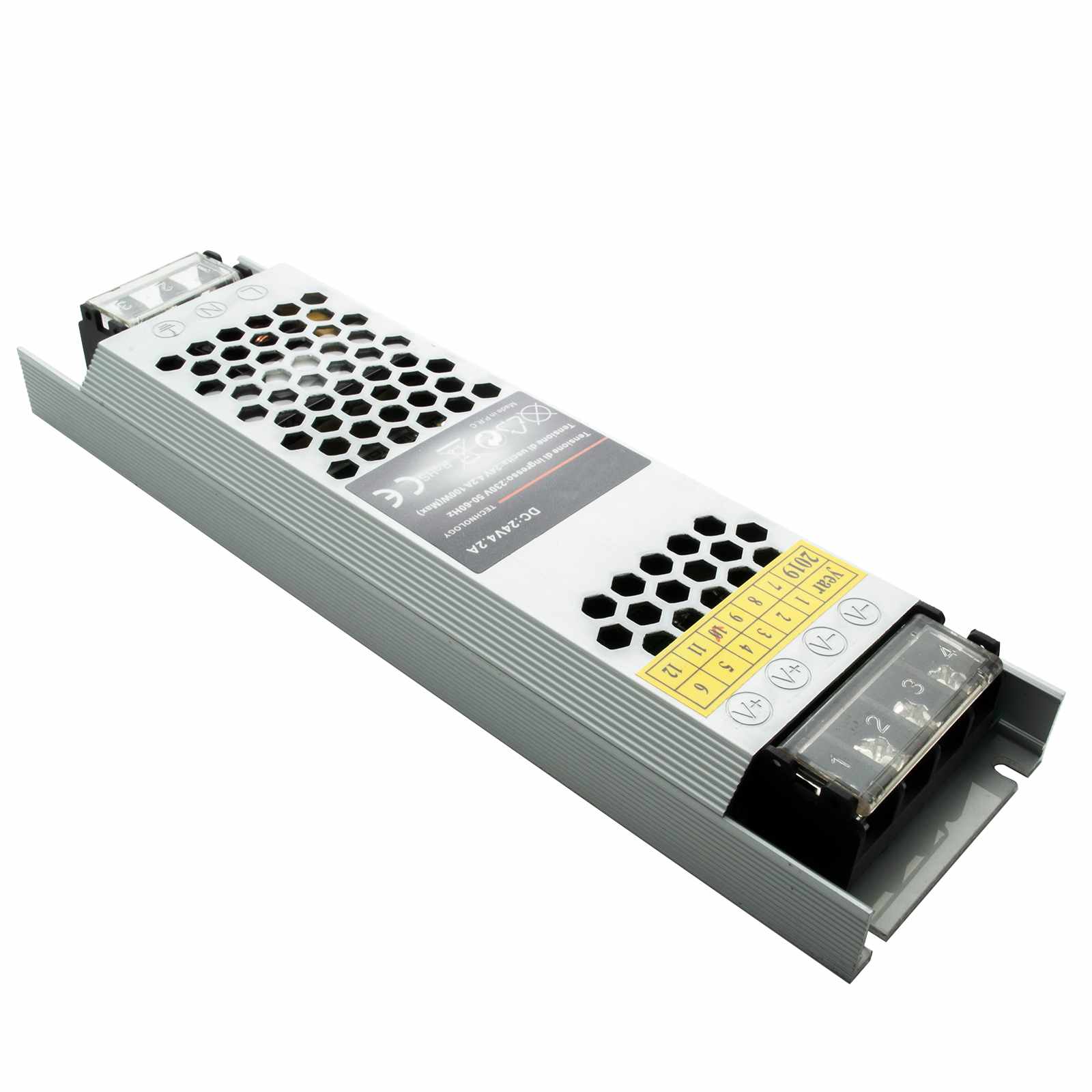 In tutti i Set è incluso l'alimentatore: Potenza 100W oppure da 200W con tensione in uscita 24V realizzato in alluminio da design compatto si alimenta a 230V ed ha la struttura forata con dissipazione passiva (senza ventole) per un miglior raffreddamento.