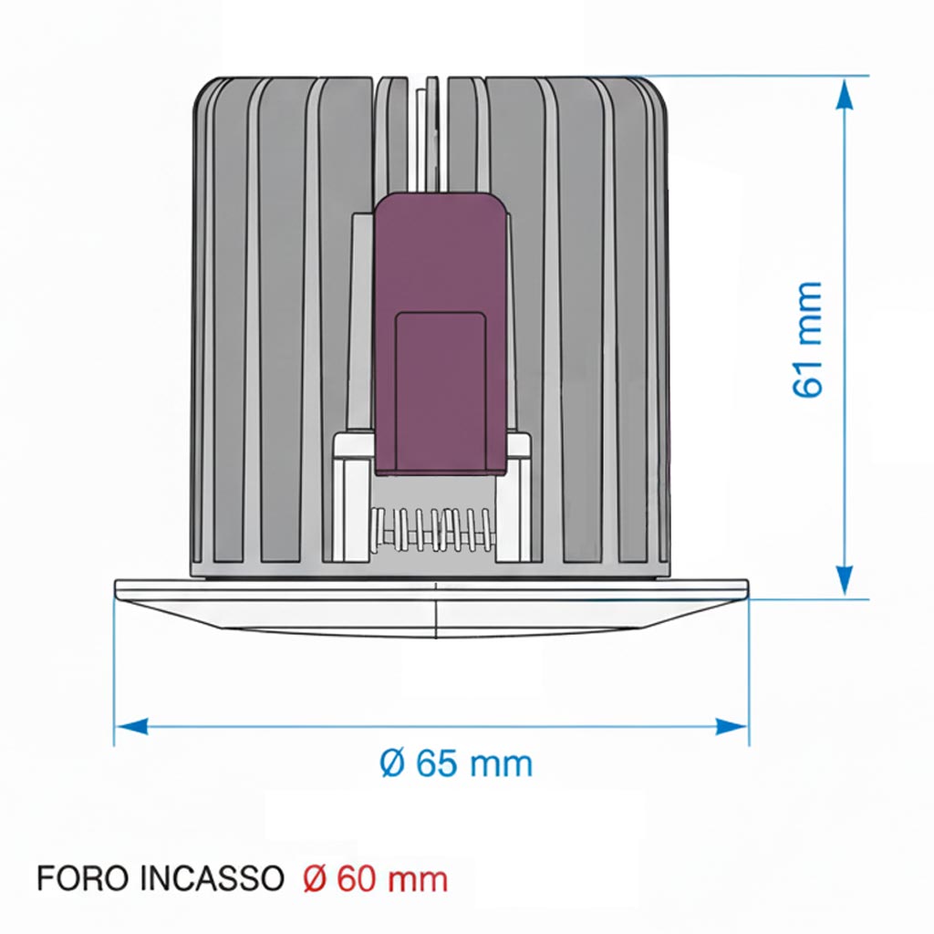 L’installazione è semplice e adatta a superfici in cartongesso o legno con foro di incasso da Ø 60mm. Il faretto ha dimensioni di: Ø 65mm (diametro esterno) x 61mm (altezza).