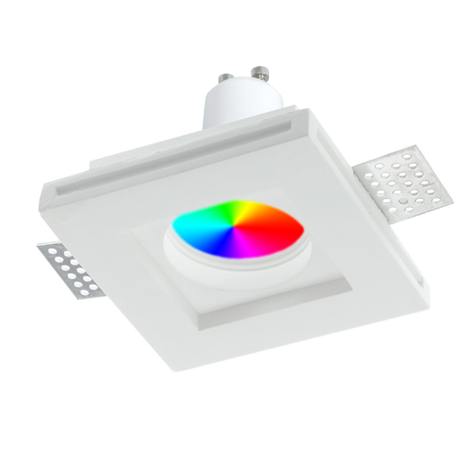 Faretto in gesso dal design slim adatto per installazioni ad incasso a scomparsa dalla forma quadrata tinteggiabile per installazioni nel cartongesso. Compatibile con lampade GU10, GU5.3, MR16. Una volta installato, stuccato e rasato può essere tinteggiato con pittura murale, la cornice scompare quindi alla vista e rimane visibile solamente il foro dov'è alloggiata la lampada.
