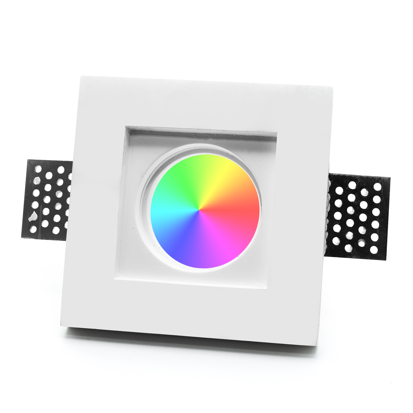 Faretto in gesso dal design slim adatto per installazioni ad incasso a scomparsa dalla forma quadrata tinteggiabile per installazioni nel cartongesso. Compatibile con lampade GU10, GU5.3, MR16. Una volta installato, stuccato e rasato può essere tinteggiato con pittura murale, la cornice scompare quindi alla vista e rimane visibile solamente il foro dov'è alloggiata la lampada.