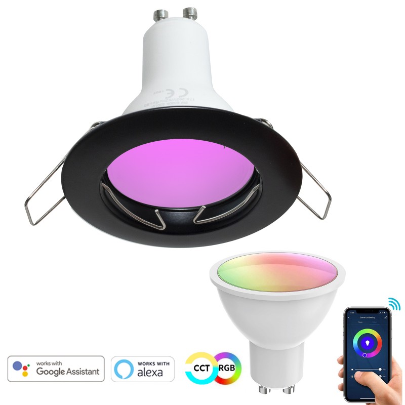 Faretto intelligente dotato di alette a molla per l'incasso in soffitti di cartongesso realizzato in alluminio. Il portafaretto viene fornito completo di lampada LED RGB+CCT con potenza 5W dotata di tecnologia WiFi per il controllo da remoto tramite smarphone scaricando l'APP "SMART LIFE" oppure utilizando gli assistenti vocali Amazon Alexa e Google Home. La lampada è dotatoa di attacco GU10 si alimenta a 230V ed ideale per l'illuminazione interna in controsoffitti di cartongesso.