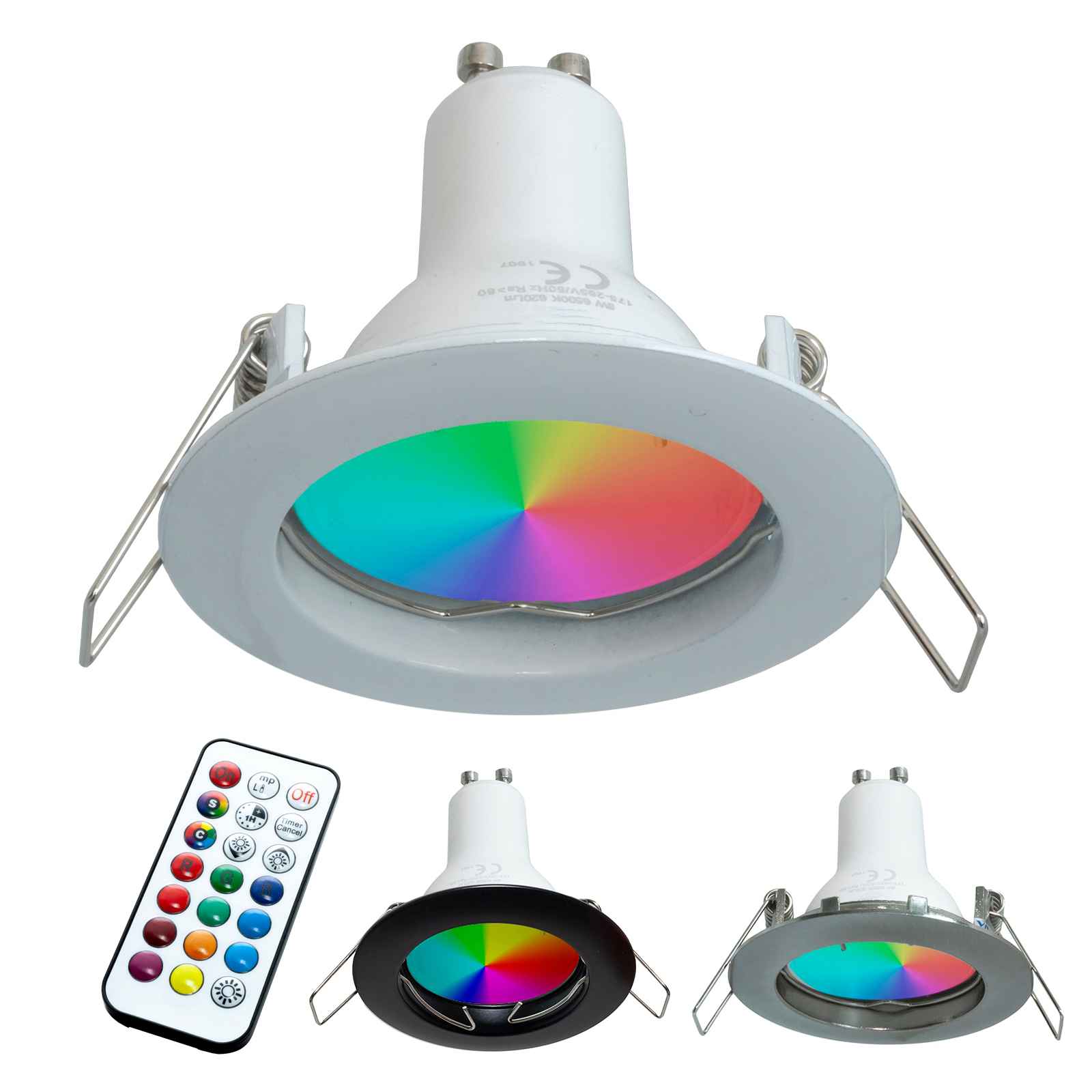 Faretto LED multicolore tondo in metallo adatto per il fissaggio in soffitto di cartongesso. Completo di faretto led con attacco GU10 e fermalampada, ottimo per creare effetti di luce colorata in ambienti interni come abitazioni, uffici, negozi, bar, pub, oppure la cromoterapia di centri abbronzanti, centri estetici, centri benessere.