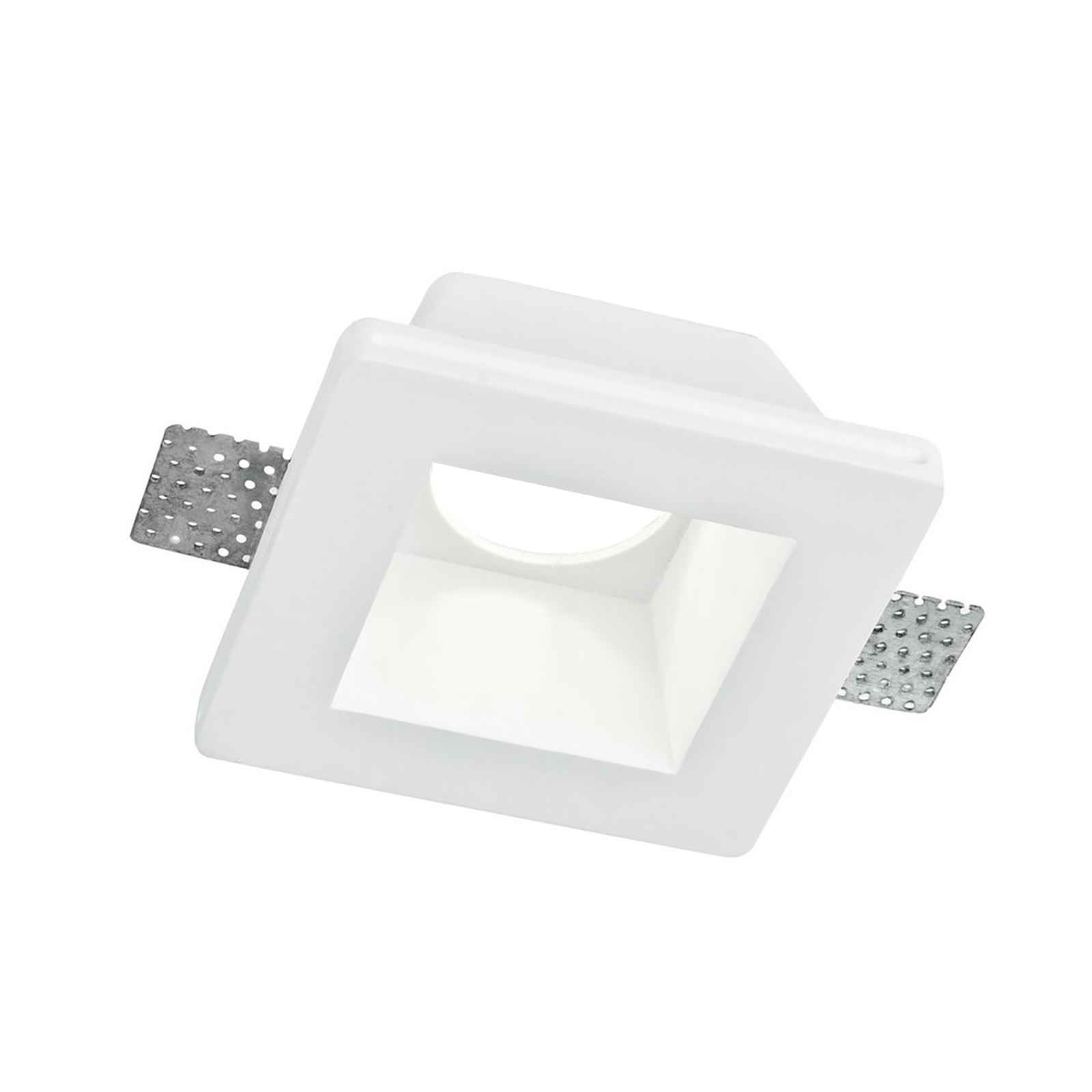 Faretto in gesso ad incasso dalla forma quadrata tinteggiabile secondo l'arredamento e la pittura, adatto per installazioni nel cartongesso o pareti. Design moderno dall'effetto ottico particolare. Completo di lampada LED GU10 con potenza 8W. Dotato di diffusore in vetro satinato che generata un effetto luce molto gradevole che non abbaglia la vista. Ideale per dare un tocco di originalità ai propri ambienti interni come corridoi, cucine, ingressi, soggiorni, negozi, uffici, attività commerciali.