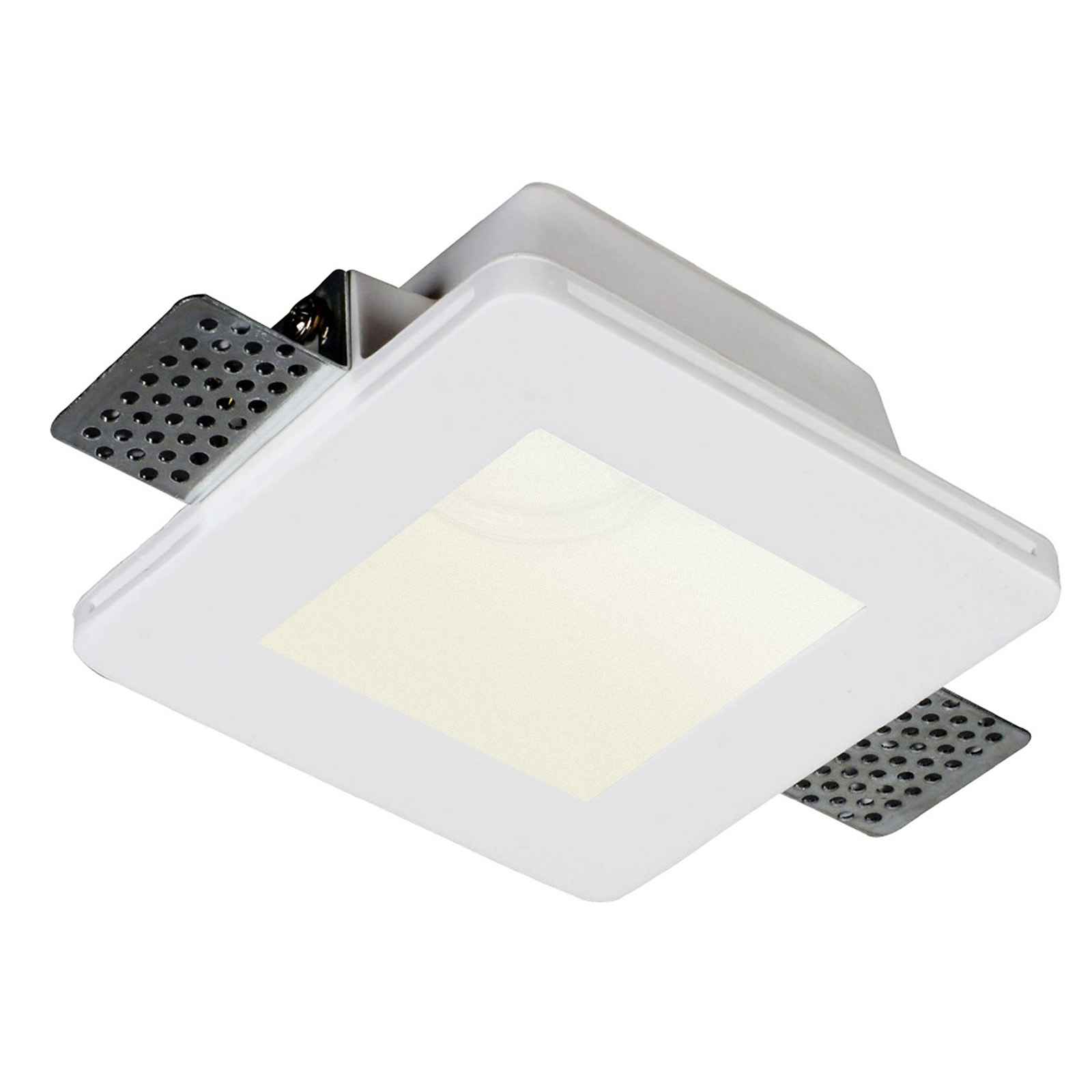 I faretti in gesso, sono ideali per installazioni in pareti e soffitti in cartongesso. Nei faretti da parete, si sbizzarrisce in modo particolare la fantasia, perché si può creare la luce a scomparsa, cioè il faretto verniciato dello stesso colore della parete, disegna nella stessa parete un gioco di luce, senza mettere in risalto la sua fonte, creando effetti speciali da un design particolare e fonte di alta tecnologia. La lampadina è coperta da un vetro satinato. Dimensioni del foro consigliato 125 x 125 mm - Dimensioni: 120 x 120 mm - Spessore: 60 mm. Nella confezione è incluso anche l'attacchino GU10 per il collegamento della lampada alla rete elettrica.