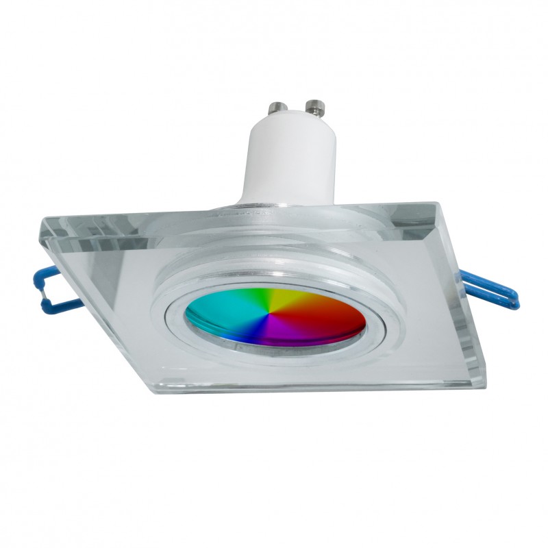Faretto LED GU10 luce colorata ad incasso completo di portafaretto con cornice quadrata in vetro con effetto specchiato, adatto per il fissaggio in soffitti di cartongesso per creare giochi di luce o effetti di luce colorata in locali come discoteche, bar pizzerie, ristoranti.