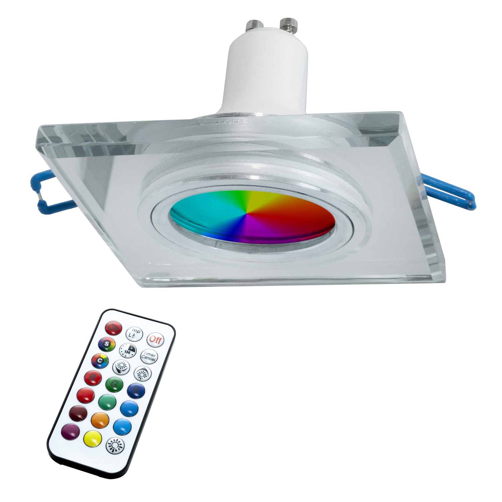 Faretto LED GU10 luce colorata ad incasso completo di portafaretto con cornice quadrata in vetro con effetto specchiato, adatto per il fissaggio in soffitti di cartongesso per creare giochi di luce o effetti di luce colorata in locali come discoteche, bar pizzerie, ristoranti.