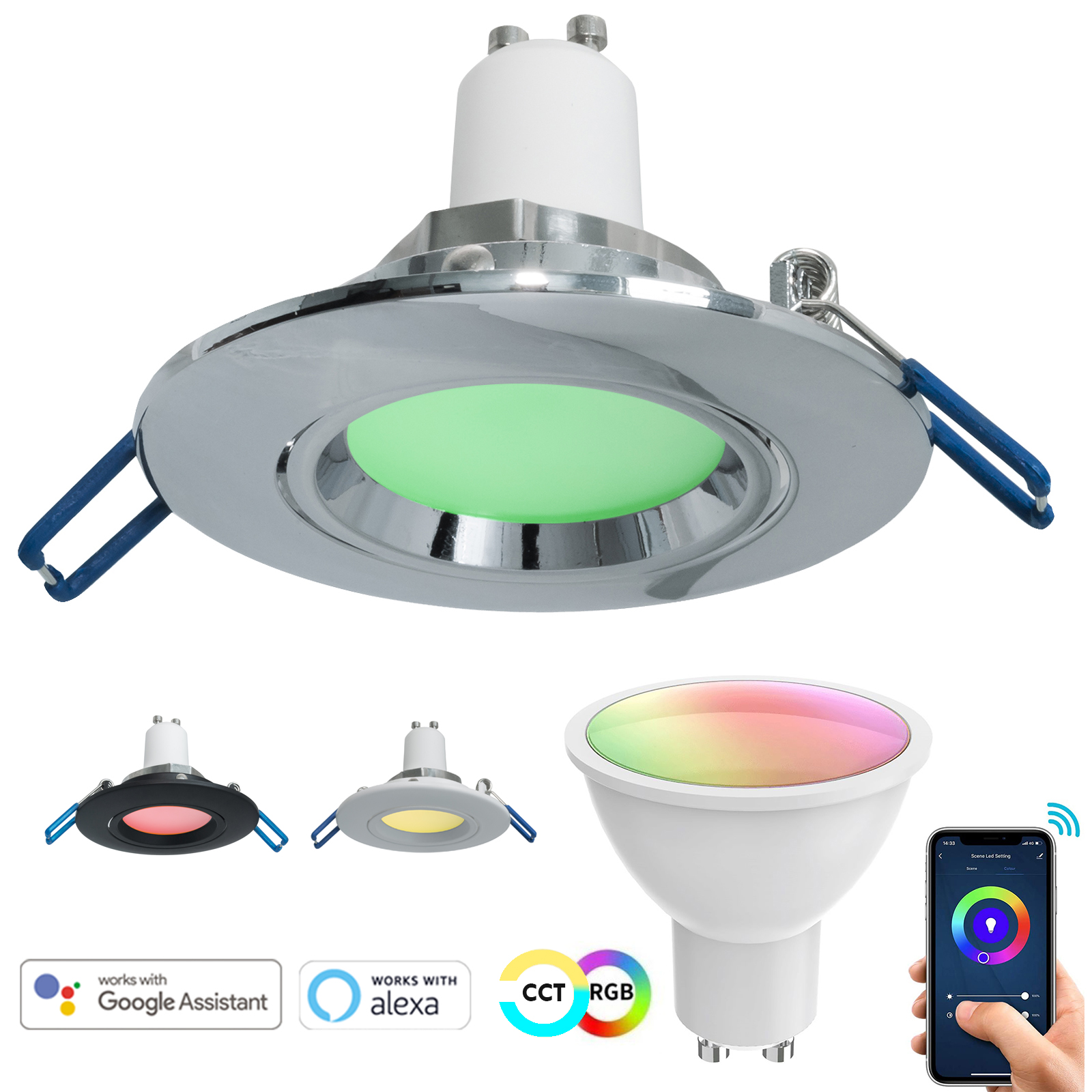 Faretto intelligente dotato di diffusore orientabile ed alette a molla per l'incasso in soffitti di cartongesso realizzato in alluminio. Il portafaretto viene fornito completo di lampada LED RGB+CCT con potenza 5W dotata di tecnologia WiFi per il controllo da remoto tramite smarphone scaricando l'APP "SMART LIFE" oppure utilizando gli assistenti vocali Amazon Alexa e Google Home. La lampada è dotatoa di attacco GU10 si alimenta a 230V ed ideale per l'illuminazione interna in controsoffitti di cartongesso.