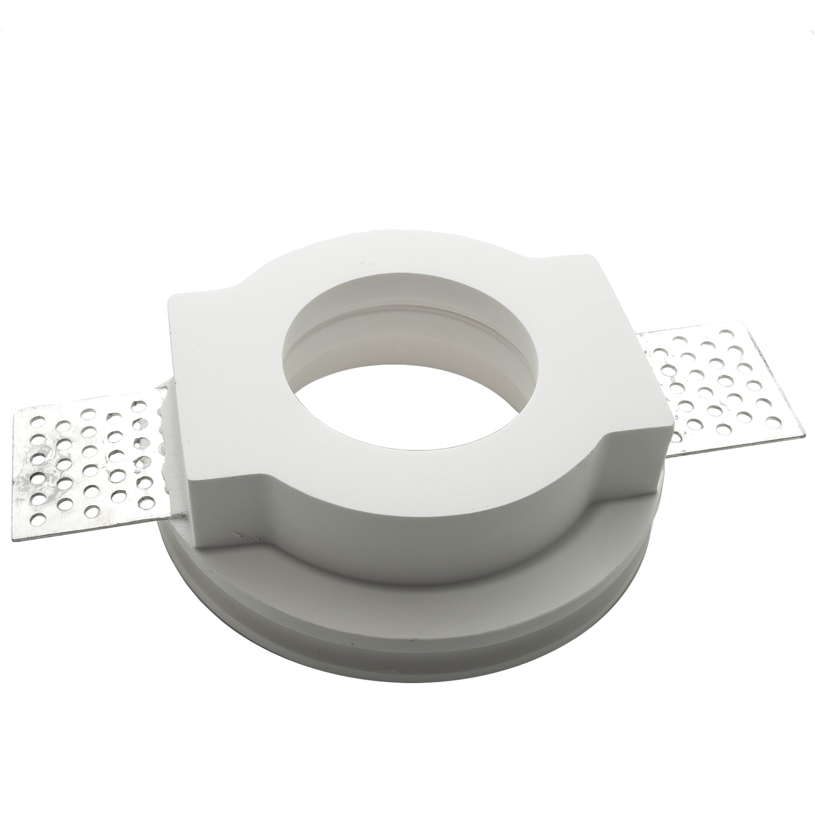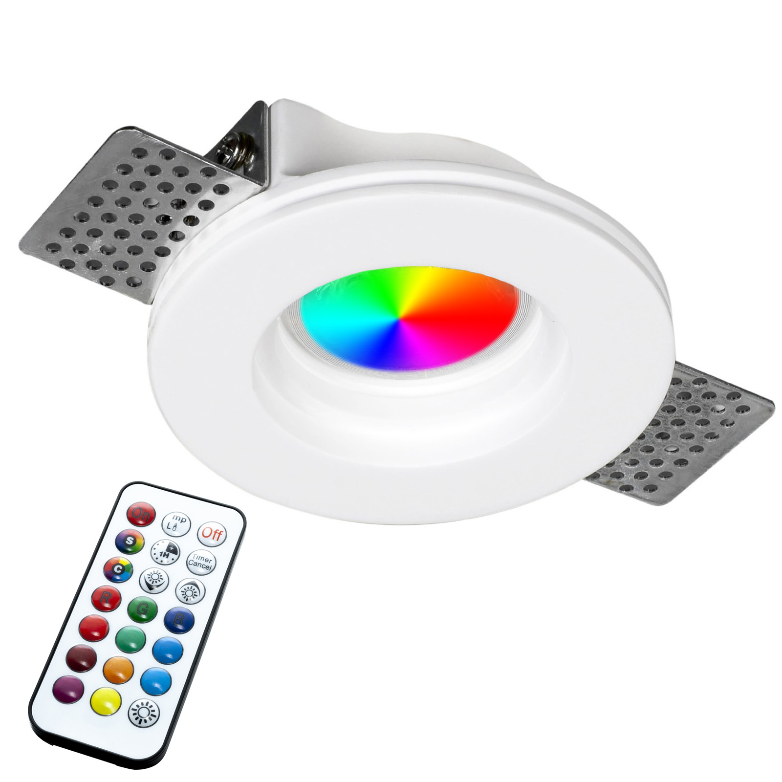 Porta faretto in gesso incasso a scomparsa completo di lampada RGBW da 6W con attacco GU10 di forma rotonda tinteggiabile per installazioni nel cartongesso. Adatto per l'illuminazione decorativa di centri massaggio, centri estetici, negozi, bar, all'interno di discoteche per creare effetti di luce colorata.