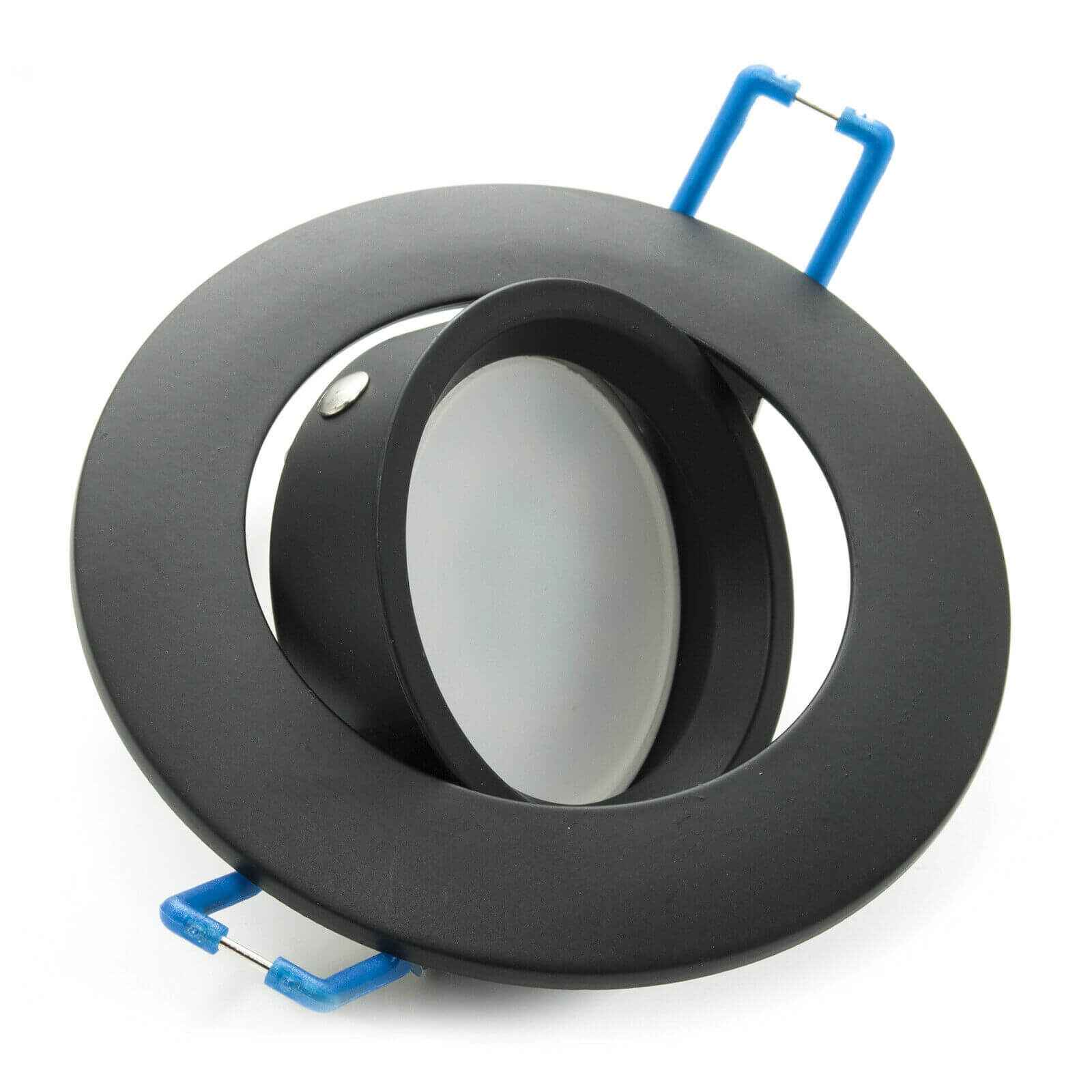 Faretto di colore nero con diffusore orientabile dotato di alette a molla per l'incasso, realizzato in alluminio di forma rotonda per installazione in soffitti di cartongesso. Il portafaretto viene fornito completo di lampada LED 8W con attacco GU10. Ghiera orientabile per direzionare la luce secondo le esigenze. Lampada intercambiabile, supporta lampade con diametro 50mm. Dotato di ferma faretto posteriore non visibile.
