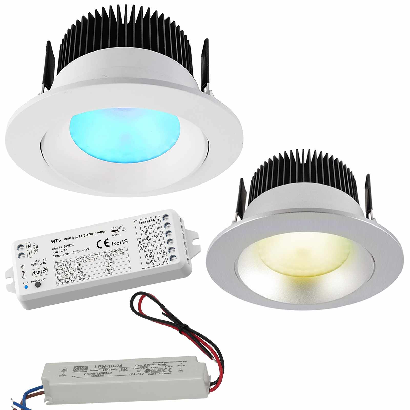 KIT professionale completo di un faretto incasso LED RGB + 3000K, una centralina SMART WiFi con controllo vocale, un telecomando RF ed un alimentatore a 24V adatto per la cromoterapia e l'illuminazione decorativa di ambienti interni.