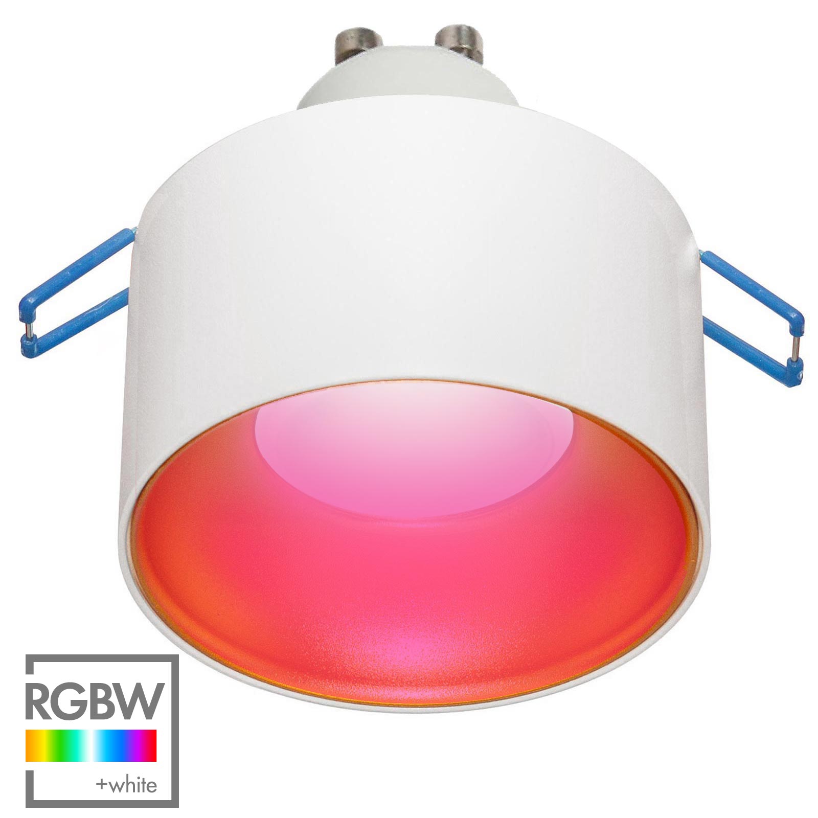 Serie Polla, elegante faretto tondo da incasso stile plafoniera dal design moderno completo di lampada LED 6W GU10 RGBW dotato di alette a molla per l'incasso in controsoffitti di cartongesso realizzato in alluminio di colore bianco con diffusore dorato ideale per dare un tocco di eleganza e colore ai propri ambienti come come bar, ristoranti, negozi, per creare effetti di cromoterapia in centri estetici, centri abbronzanti.