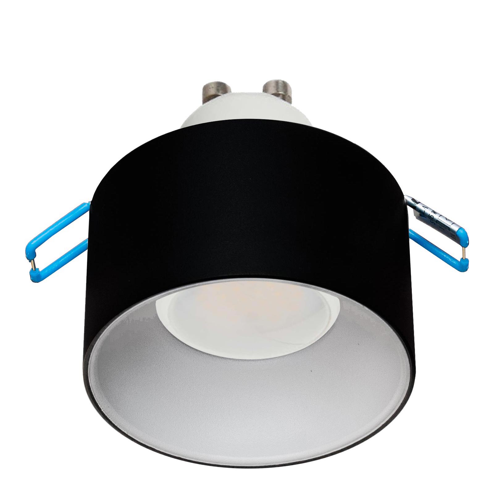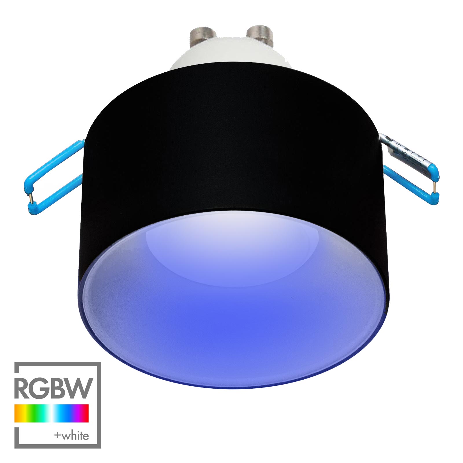 Serie Polla, elegante faretto tondo da incasso stile plafoniera dal design moderno completo di lampada LED 6W GU10 RGBW dotato di alette a molla per l'incasso in controsoffitti di cartongesso realizzato in alluminio di colore nero con diffusore bianco ideale per dare un tocco di eleganza e colore ai propri ambienti come come bar, ristoranti, negozi, per creare effetti di cromoterapia in centri estetici, centri abbronzanti.