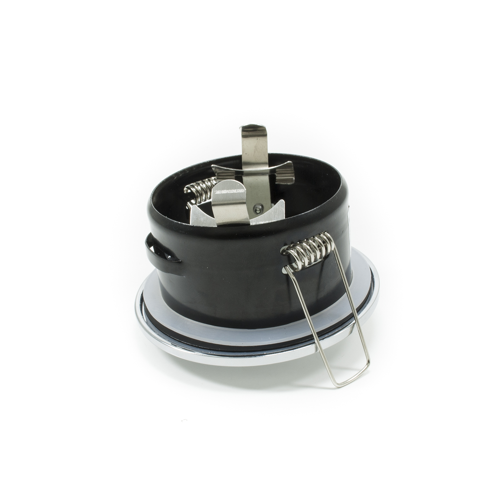 Faretto da incasso, struttura in alluminio, finitura crfomo lucido, sistema di fissaggio al controsoffitto tramite molle, può essere istallato anche in ambienti con presenza di umidità bagno e doccia, IP65.